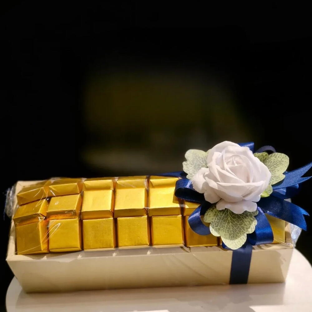 دلّل نفسك بكمال الفستق: كنز مغلف بالذهب من الشوكولاتة الشهية، مزين بأناقة بوردة ذات لون ناعم. مزيج مُنتقى من النكهة والجمال.
