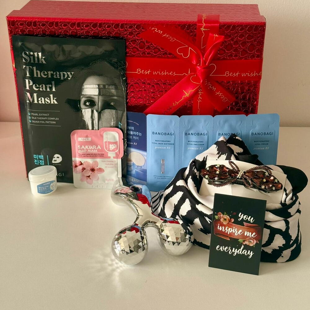 صندوق هدايا أنيق وفاخر للعناية الذاتية مصمّم للدلال والإعجاب والإلهام. تم اختياره بعناية للنساء اللواتي يقدّرن الجمال والاسترخاء والتفاصيل الفاخرة، ويخلق هذا الطقم تجربة سبا متكاملة في المنزل. مقدّم في علبة هدايا حمراء مذهلة ذات ملمس مع شريط، إنه الخيار المثالي للمناسبات الرومانسية أو أعياد الميلاد أو المفاجآت ذات المغزى. ⸻ Inside the box: • Facial lifting & massage beauty device (for glowing, refreshed skin) • Silk-style hair scarf (elegant and versatile accessory) • Premium decorative hair clip • Banobagi skincare ampoule set for hydration & radiance • Banobagi Silk Therapy Pearl Mask – brightening & smoothing effect • LAIKOU Sakura mud mask for deep cleansing • Inspirational message card • Luxury rigid gift box with elegant ribbon ⸻ Why it stands out: • 💝 Romantic premium presentation that feels truly special • ✨ Complete beauty + skincare + self-care experience • 🎁 Ready-to-gift (no extra wrapping needed) • 🌟 Includes trending Korean skincare favorites ⸻ Perfect for: • Valentine’s Day • Birthday gift for her • Anniversary gift • Self-care & wellness gifts • Surprise for wife, girlfriend, or friend
