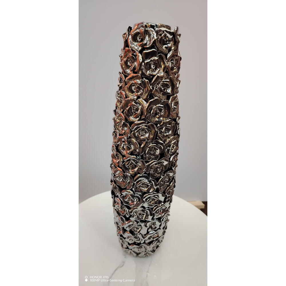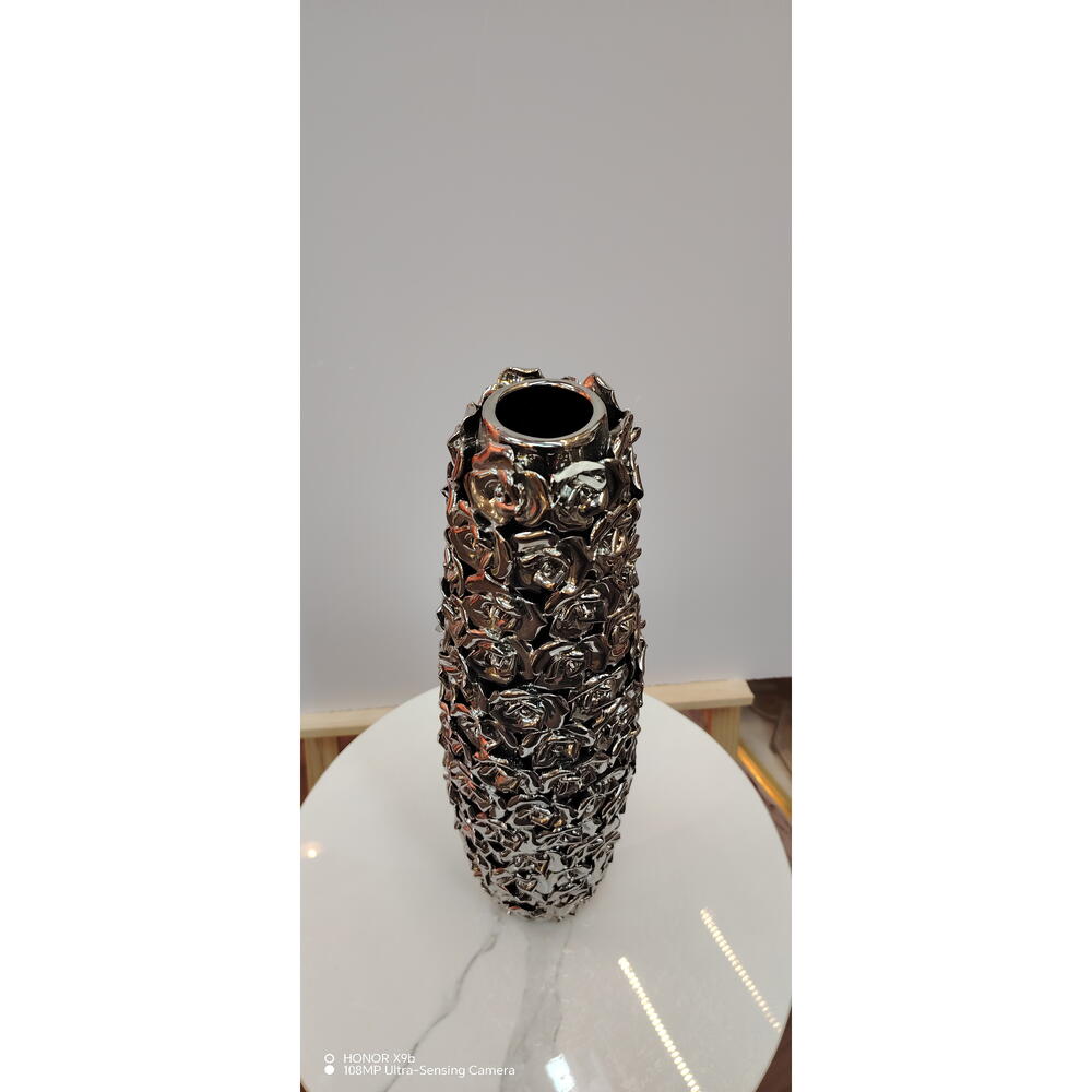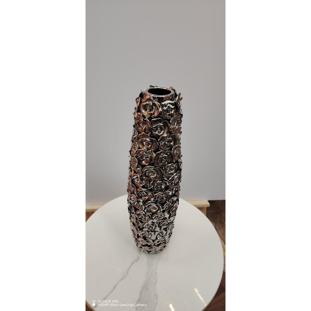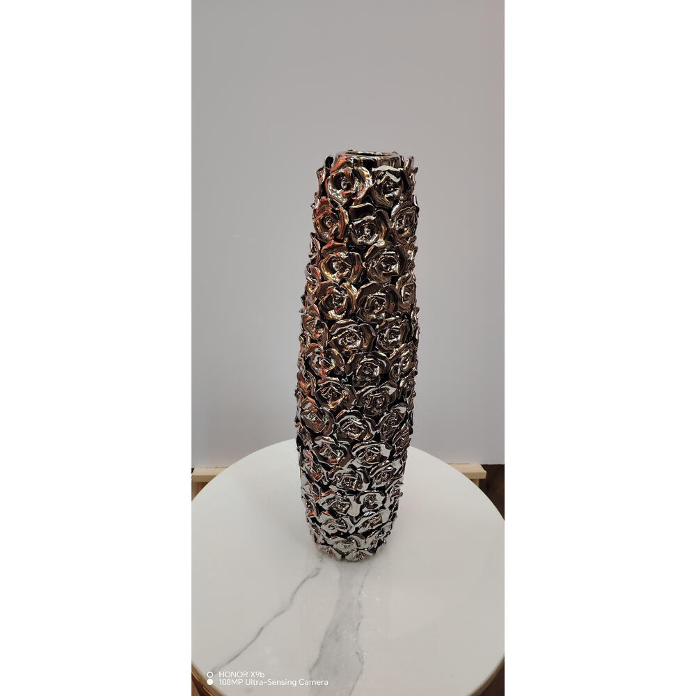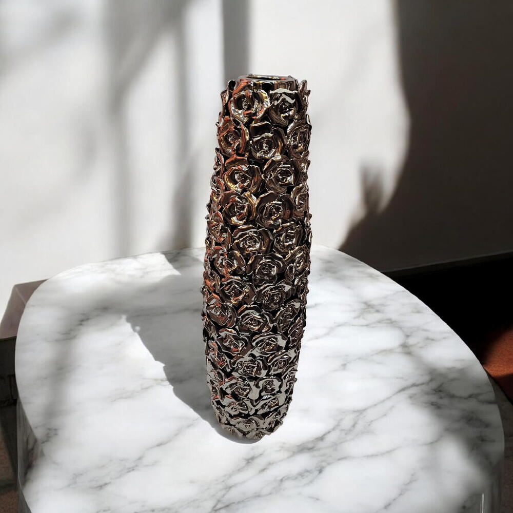 المادة: سيراميك/بورسلان اللون: فضي كرومي / لمسة نهائية معدنية التصميم: نقش ورد بارز ثلاثي الأبعاد التشطيب: عالي اللمعان وعاكس الشكل: أسطواني طويل الطراز: فاخر / ديكور معاصر الاستخدام: مزهرية للزهور أو قطعة ديكور بارزة الفتحة: عنق ضيق للسيقان المرتبة