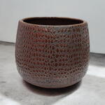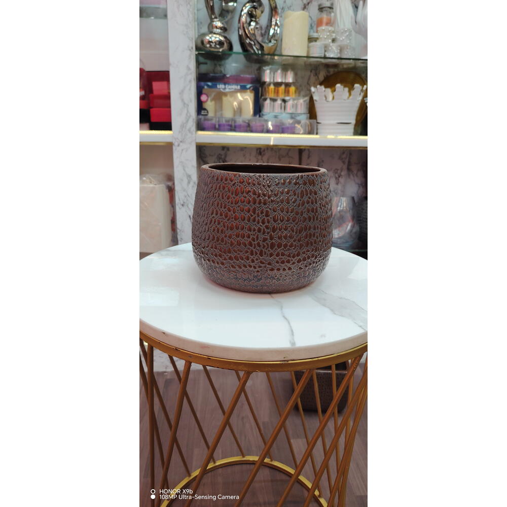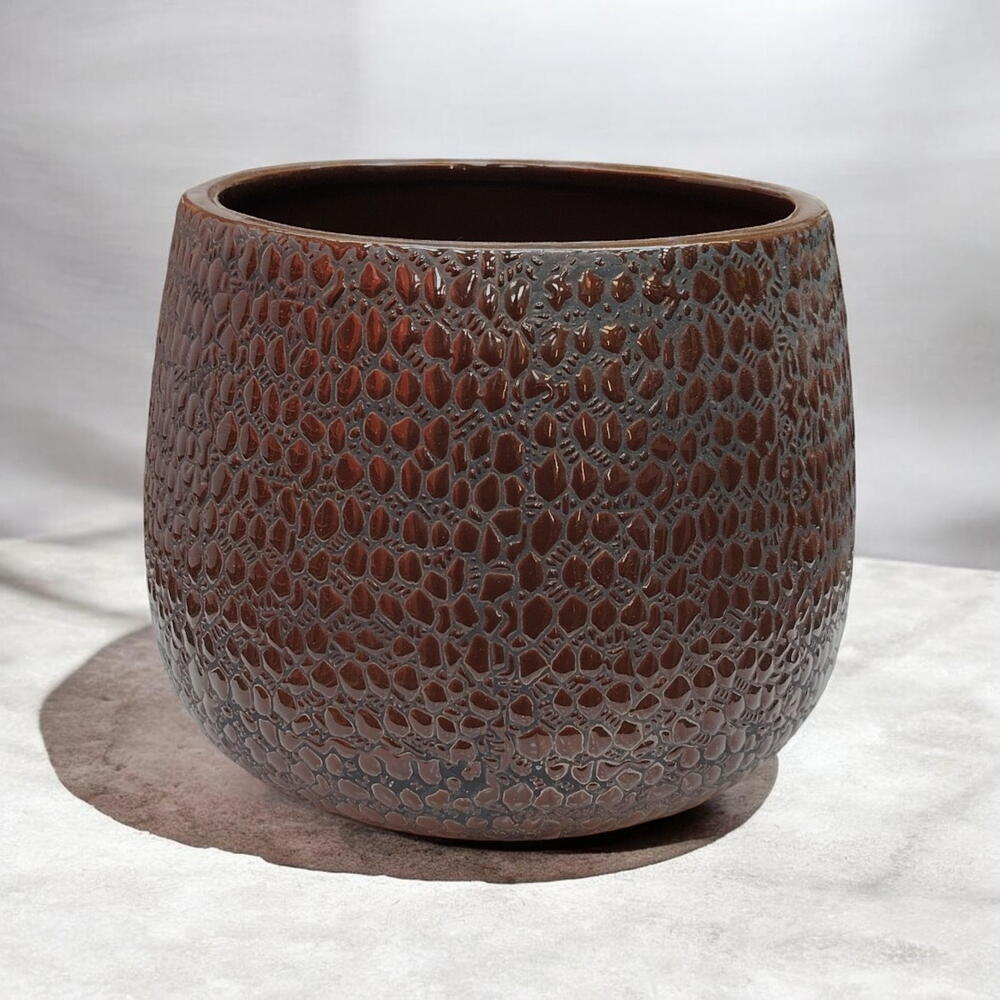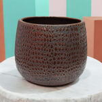 المادة: سيراميك مطلي بالمينا اللون: بني غامق بنقشة ملمسية الشكل: دائري، بفتحة واسعة التشطيب: لامع، سطح منقوش بارز الاستخدام: وعاء نباتات داخلي / حامل زخرفي الأسلوب: ريفي / ديكور حديث الوضع: على الطاولة أو الرف المتانة: متين ويدوم طويلاً