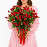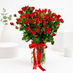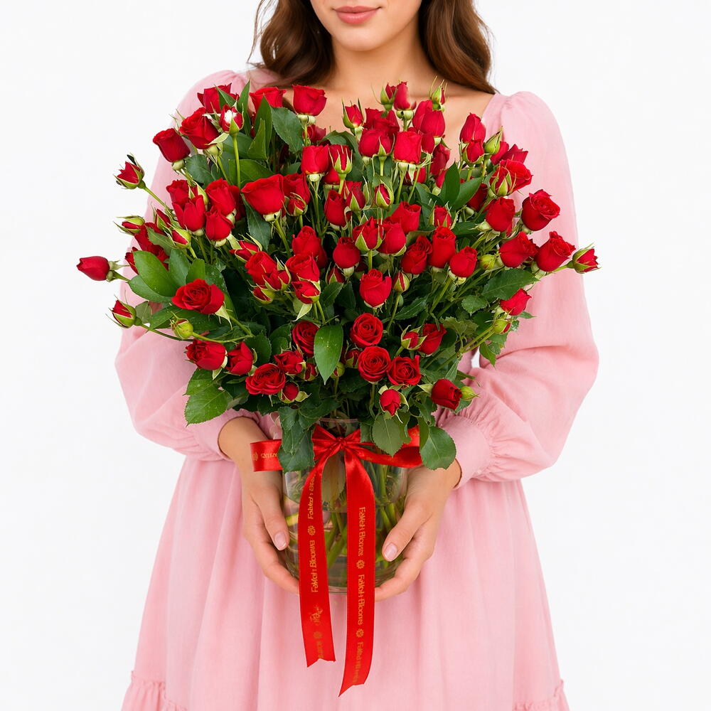 رمز خالد للحب والشغف، مزهرية الشغف بـ15 وردة سبرَيّ حمراء مصممة لجعل كل لحظة لا تُنسى. تتميز بعنقود من ورد السبرَيّ الحمراء المخملية، حيث تتفتح على كل ساق عدة براعم رقيقة—مما يخلق مظهراً أكثر امتلاءً وفخامة ينبعث منه الرومانسية والحدة. مزدان بأوراق روسكوس خضراء كثيفة، يحقق هذا التنسيق انسجاماً مثالياً بين الغنى والانتعاش، بينما تضيف المزهرية الزجاجية الصافية لمسة من الأناقة المعاصرة. يُكمل الشريط الساتاني الأحمر الجريء المظهر ببيان من الأناقة والاحتفال. مثالي للإيماءات الرومانسية أو ذكرى سنوية أو مفاجآت مخلصة، يحول هذا التنسيق الرائع المشاعر إلى تعبير بصري مذهل—ما يجعله هدية حب لا تُنسى حقاً.