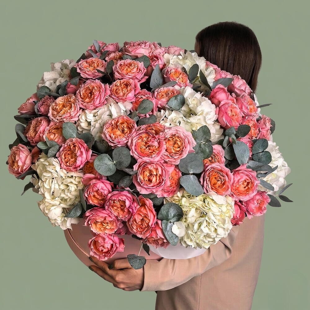 هيدرانجيا بيضاء - 9 قطع أوراق الأوكالبتوس - 10 قطع أشرطة الساتان - 3 قطع قبعة صندوقية كبيرة - 1 قطع زهور الفاوانيا الصغيرة من نوع جولييت - 20 قطع