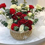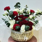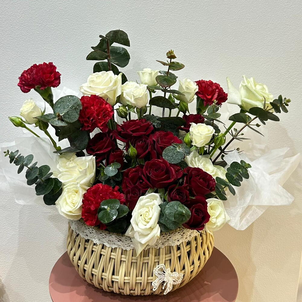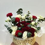 مزيج ساحر من الورود الحمراء الغنية والبيضاء النقية، مرتّب في سلة منسوجة ريفية ومزدان بأوراق أكالبتوس طازجة وقرنفل أحمر رقيق. هذا التصميم الزهري يفيض بالأناقة والدفء، مما يجعله هدية مثالية لأعياد الميلاد، وللتهنئة، أو للتعبير عن مشاعر صادقة.