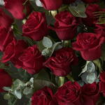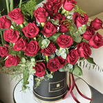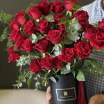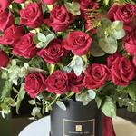 تشكيلة فاخرة من ورد أحمر ممتاز مرتبة بأناقة في صندوق قبعة أسود أنيق، مع لمسات من أوراق الأوكالبتوس الطازجة لمنح لمسة من السحر الطبيعي. يرمز هذا التصميم إلى الحب العميق والعاطفة والرقي—مثالي للمناسبات الرومانسية أو ذكرى الزواج أو المفاجآت من القلب. تخلق الأزهار الحمراء الغنية إلى جانب العرض العصري في الصندوق هدية خالدة وأنيقة تترك انطباعًا دائمًا.