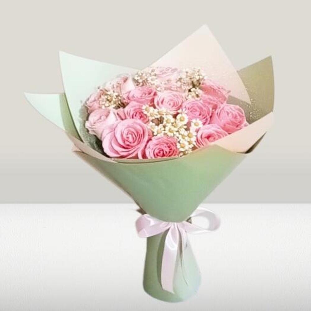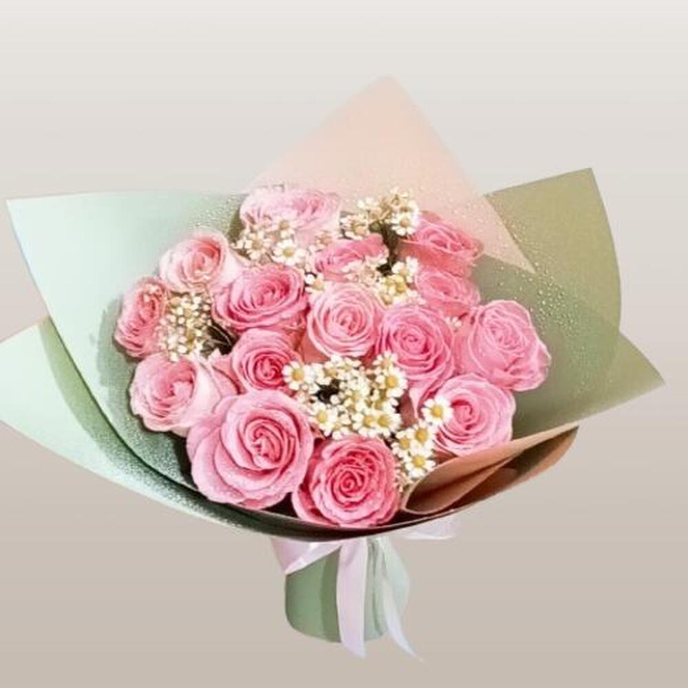Indulge in the beauty of nature with our exquisite 15 Pink Roses with Chamomile Bouquet. This stunning floral arrangement is a perfect blend of romance and tranquility, making it an ideal choice for expressing your love, appreciation, or best wishes. The bouquet features fifteen delicate pink roses, each one carefully selected for its lush petals and enchanting fragrance. Pink roses symbolize gratitude, admiration, and admiration, making them a heartfelt choice for a variety of occasions. Complementing these roses are the charming chamomile flowers, which add a touch of serenity and relaxation to the arrangement. Chamomile is known for its soothing properties and delicate appearance, making it an excellent choice for expressing care and well wishes. This handcrafted bouquet is elegantly wrapped in a soft, pastel-colored paper and tied with a coordinating ribbon, creating a visual treat that will delight the senses. Whether its a birthday, anniversary, or a gesture of support, our 15 Pink Roses with Chamomile Bouquet is sure to convey your emotions with grace and charm. Order this stunning bouquet online today and bring a smile to someones face with the beauty and sentiment it carries. Its a thoughtful gift that will be cherished and remembered.