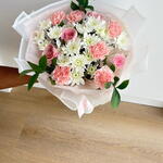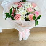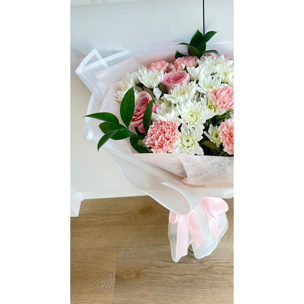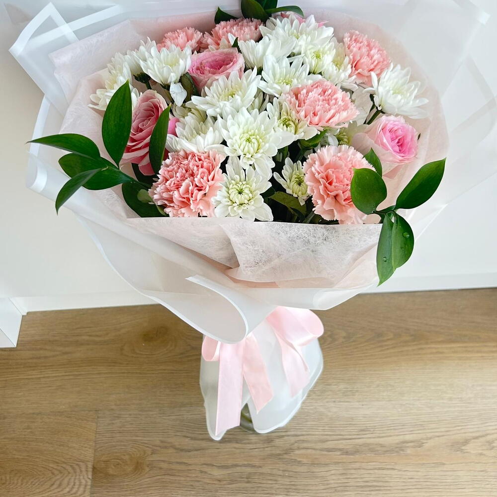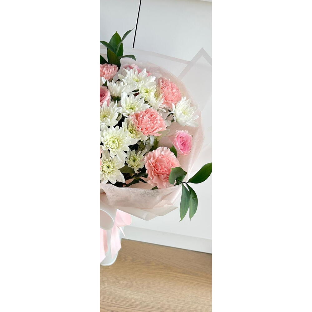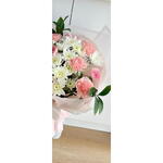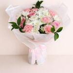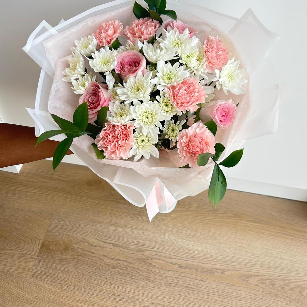 أضفِ لمسةً من البهجة إلى أي مناسبة مع هذه الباقة الأنيقة بألوان الباستيل، والتي تضمّ زهور القرنفل الوردية الرقيقة، والورود الوردية الناعمة، وزهور الأقحوان البيضاء النضرة. مُزيّنة بأوراق خضراء مورقة، ومُغلّفة بورق شفاف رقيق مربوط بشريط وردي ناعم، تُعدّ هذه الباقة مثالية لأعياد الميلاد، والذكرى السنوية، أو ببساطة للتعبير عن الحب والتقدير. باقةٌ منعشة، وعطرة، ومُصمّمة ببراعة لتُضفي البهجة والأناقة على لحظاتكم الخاصة.