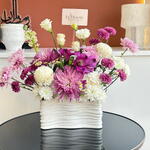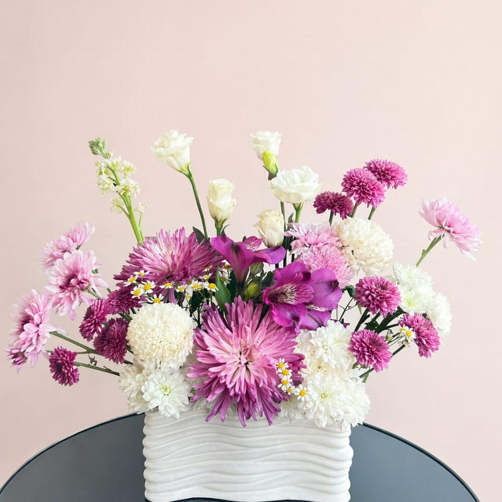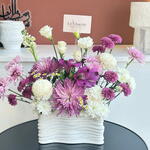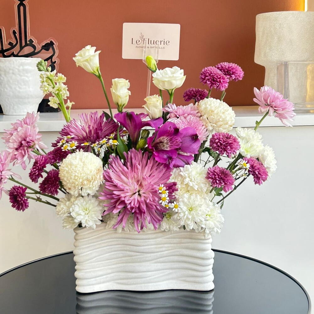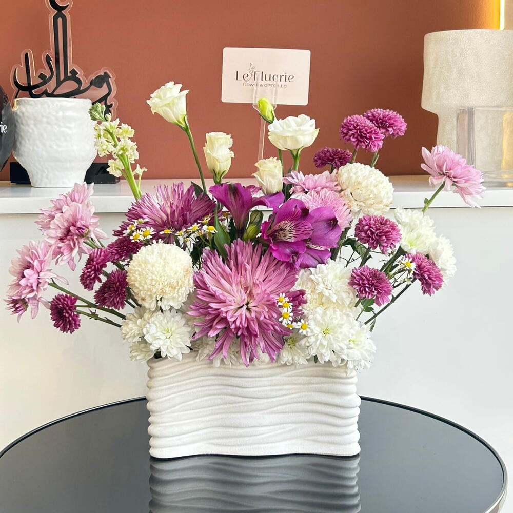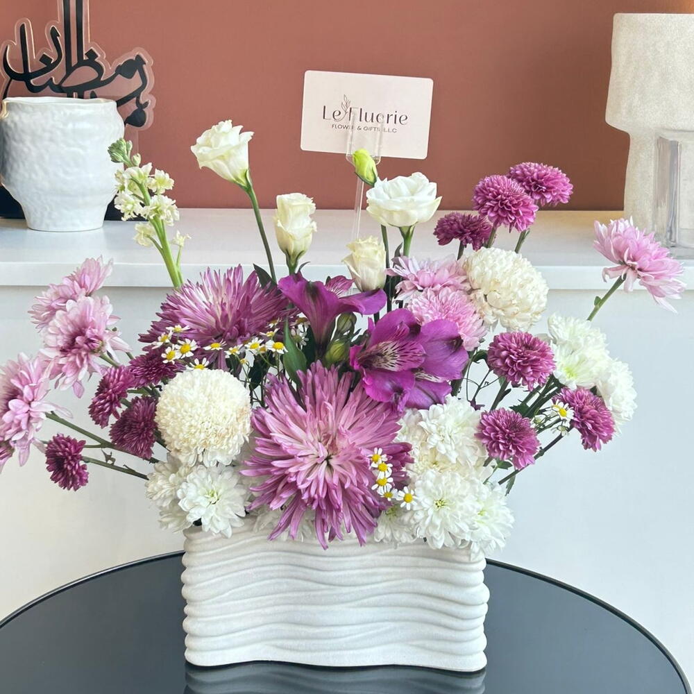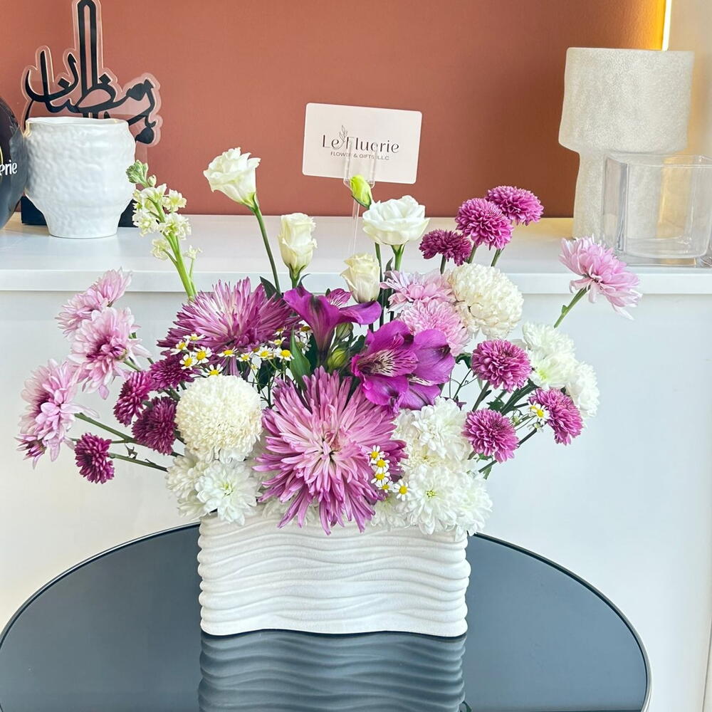 أضف لمسة من الأناقة إلى أي مساحة مع هذا التنسيق الزهري الباستيلي المذهل. يتميز بمزيج رائع من الأزهار البنفسجية والبيضاء والوردية، ويُعرض هذا التصميم بشكل جميل في مزهرية سيراميكية بيضاء ذات ملمس. مثالي للمناسبات الخاصة، أو لتزيين المنزل، أو كهدية معبرة، فهذه التنسيقة تشع بالأناقة والسحر. مُصنع يدويًا بعناية ليجلب الجمال والنضارة إلى يوم أحبائك. اطلب الآن لبيان زهري خالد.