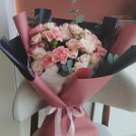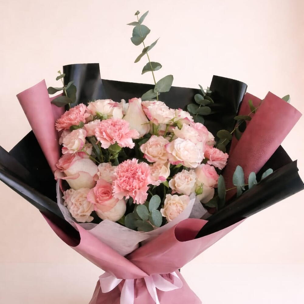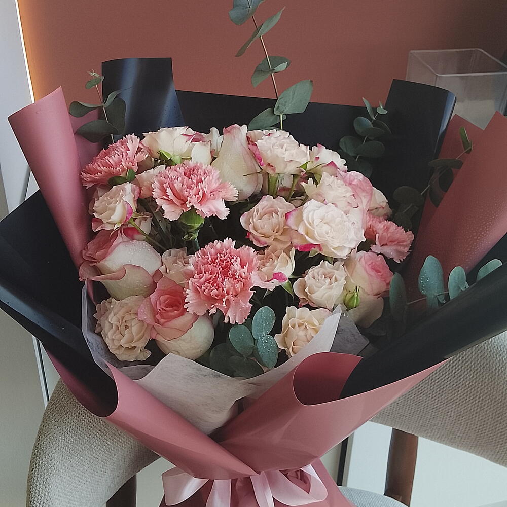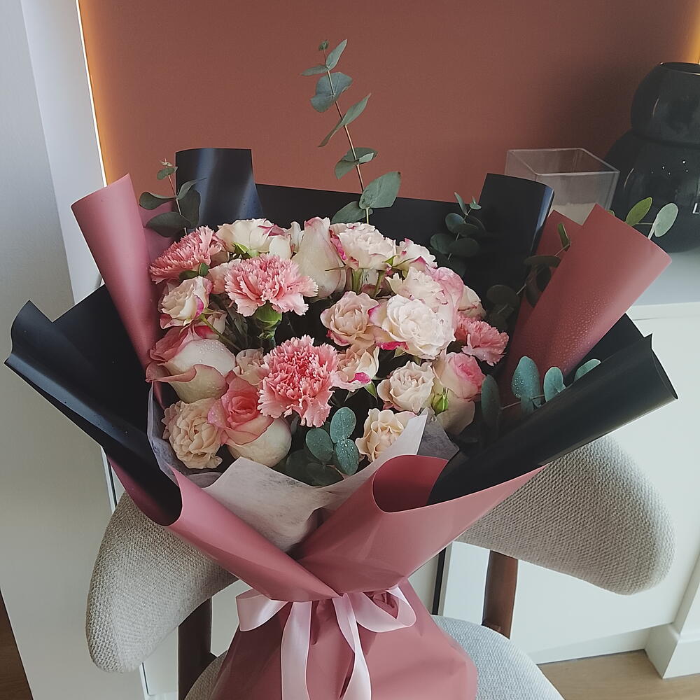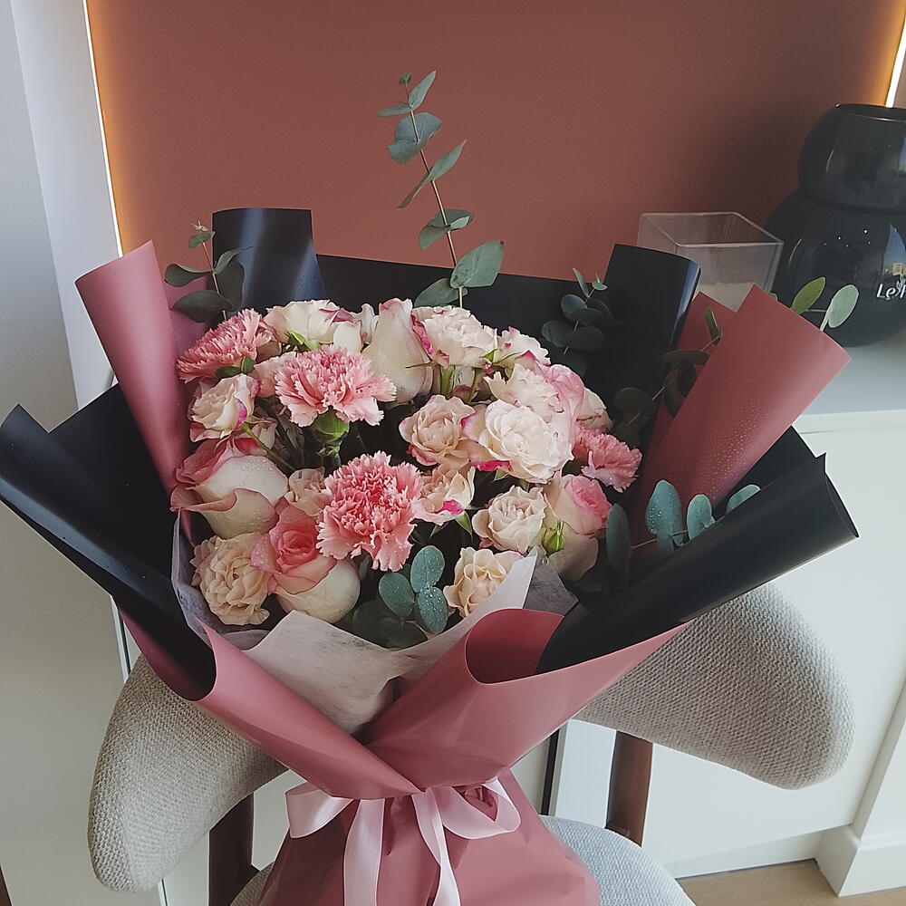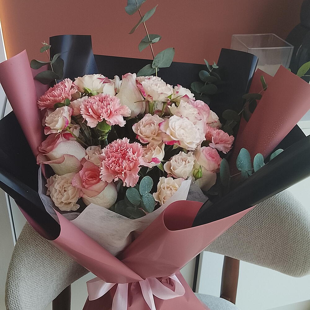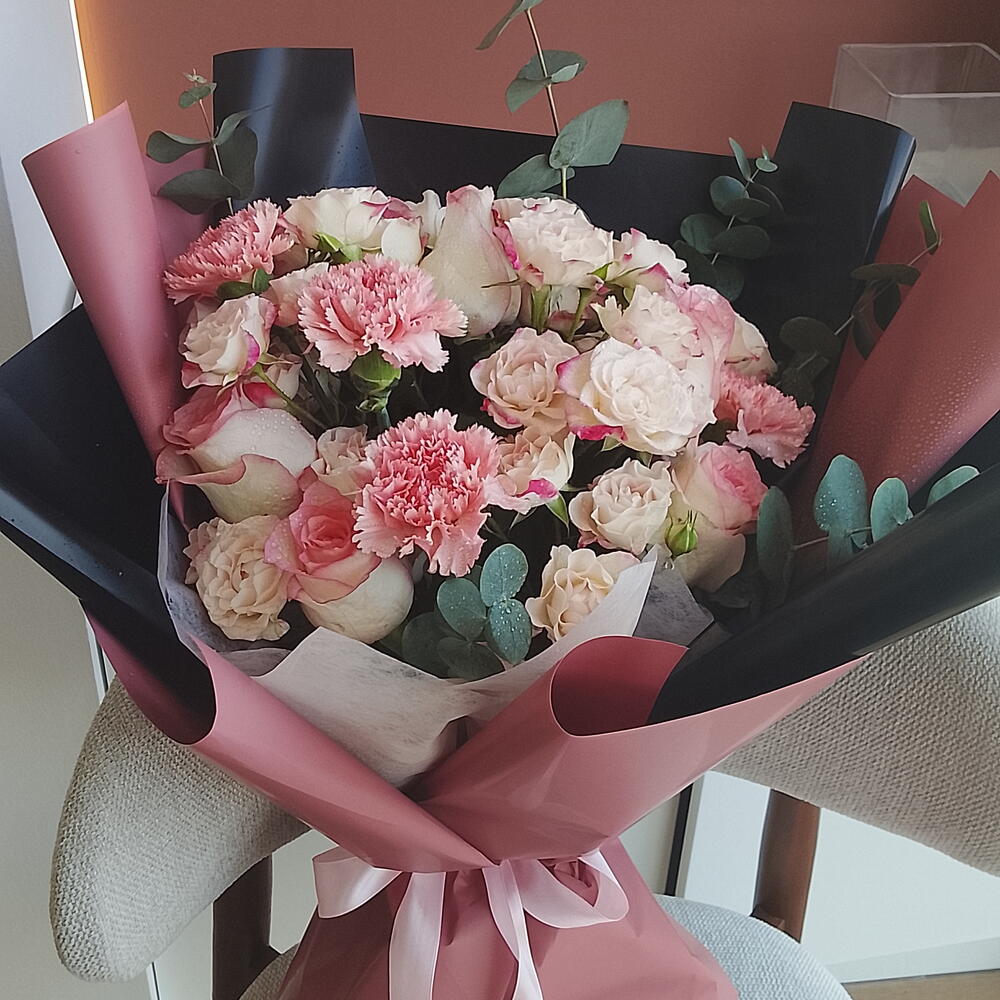 استمتع بجمال باقة الزهور الأنيقة هذه باللونين الوردي والأبيض، والتي تتألق بجمال القرنفل الوردي الناعم، والورود الوردية والخوخية الرقيقة، وأوراق الكينا الخضراء الوارفة. مغلفة بورق أنيق باللونين الوردي والأسود مع شريط ساتان متناسق، تُعد هذه الباقة هدية مثالية لحفلات الزفاف، والذكرى السنوية، وأعياد الميلاد، أو أي مناسبة خاصة. أضف لمسة من البهجة إلى أي مكان أو عبّر عن مشاعرك الصادقة مع هذه الباقة الراقية والمنعشة. اطلبها الآن لتحصل على هدية رائعة تُعبّر عن الكثير!