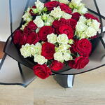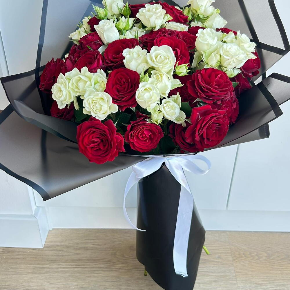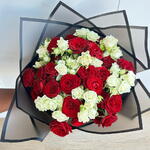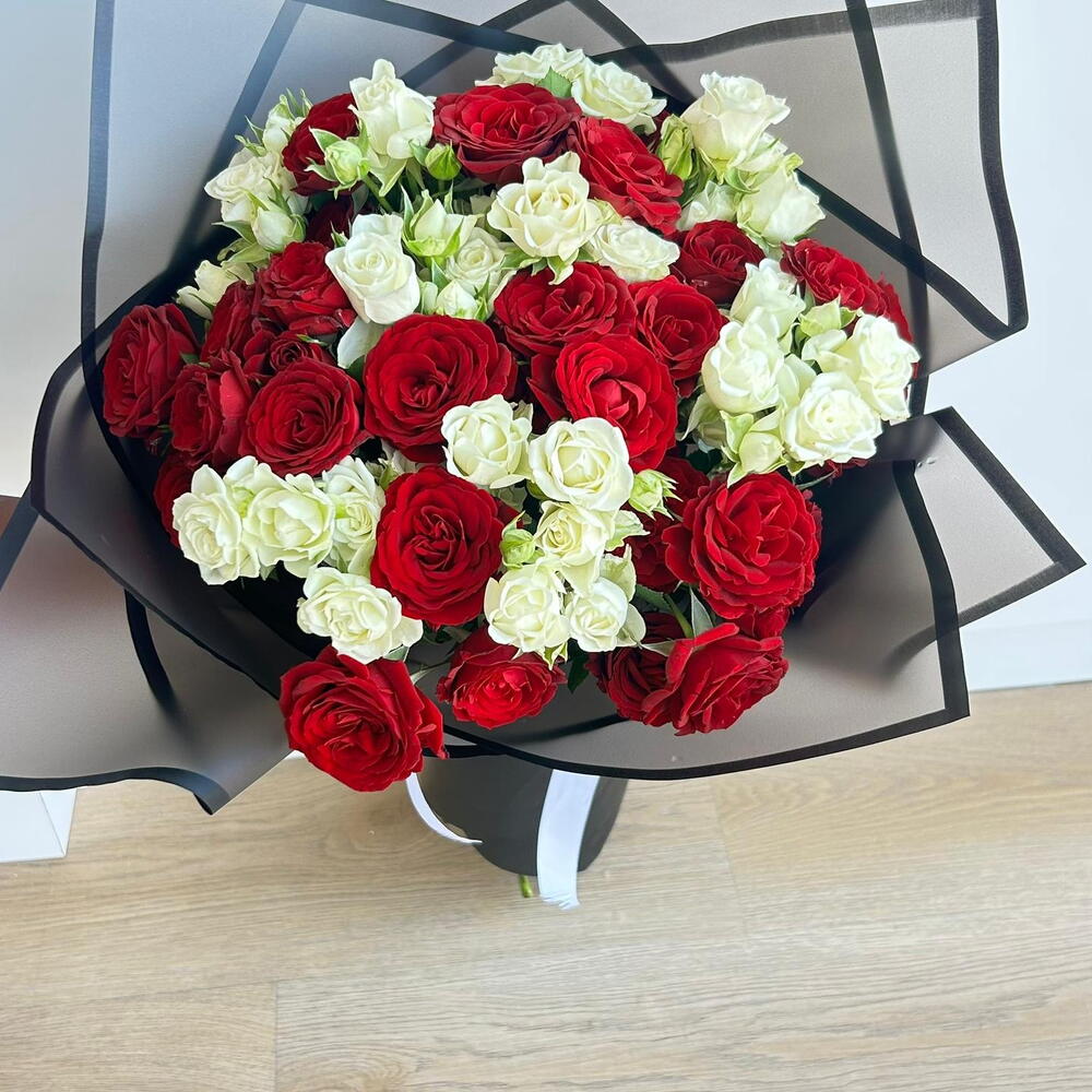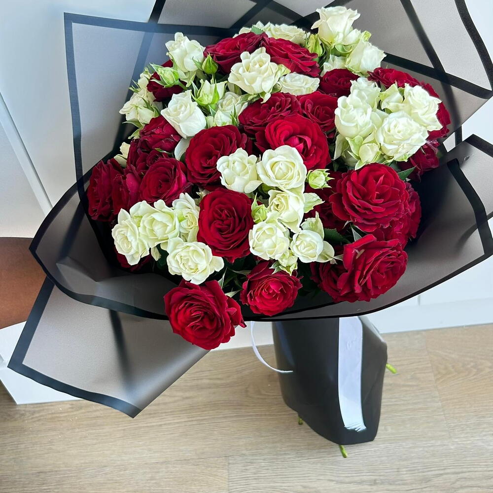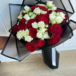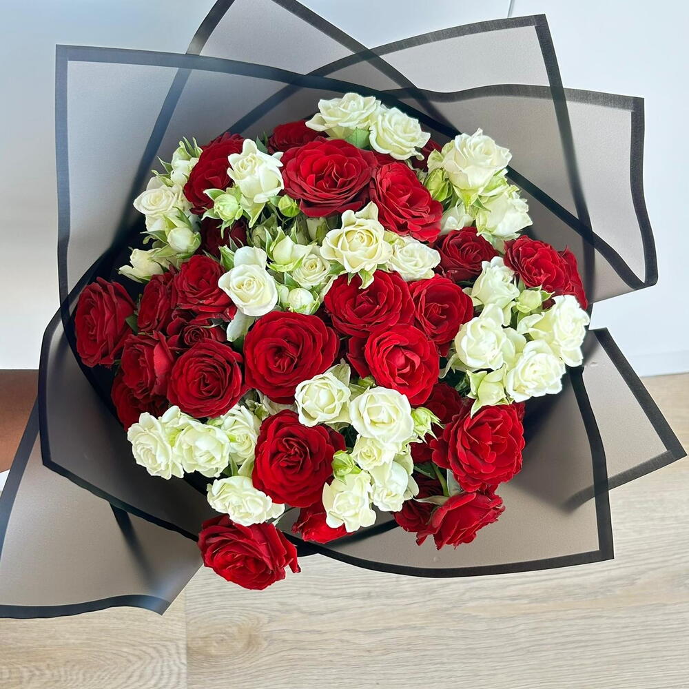 اكتشف الهدية المثالية مع هذه الباقة الأنيقة التي تضم مزيجًا مذهلاً من الورود الحمراء النابضة والورود البيضاء الكريمية. مغلفة بورق أسود شفاف وأنيق، يُجسّد هذا التنسيق الأناقة والسحر. مثالية للمناسبات الرومانسية والذكرى السنوية وحفلات الزفاف، أو لإضاءة يوم شخص ما بجمال خالد. ورود طازجة منتقاة يدويًا مُنسَّقة لابتكار هدية زهرية فاخرة ولا تُنسى. اطلب الآن للتوصيل السريع واجعل أي لحظة مميزة.