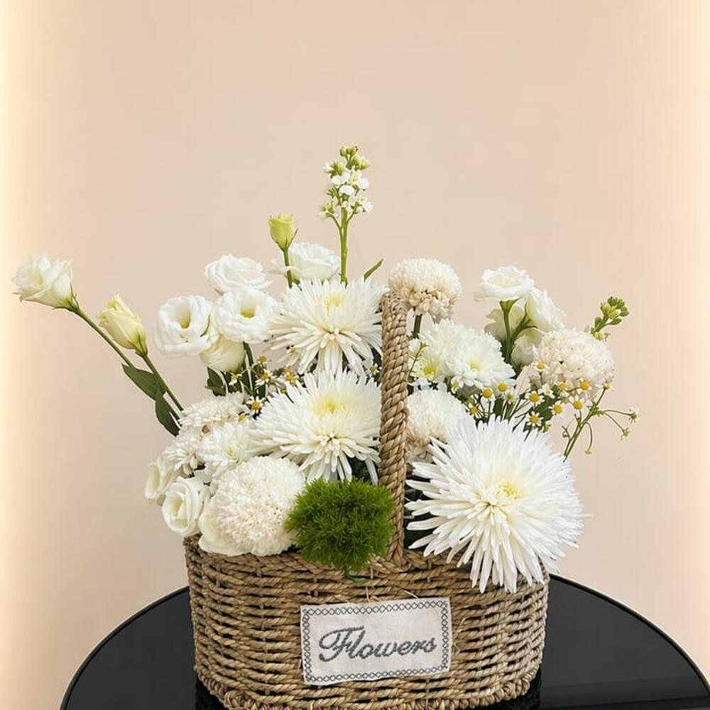 أضف لمسة من الأناقة الخالدة إلى أي مكان مع هذه السلة الزهرية البيضاء المنسقة بعناية. يتميز هذا التصميم بمزيج رقيق من الأقحوان والورود وأزهار صغيرة ناعمة، ليُضفي إحساسًا بالنقاء والرقي والهدوء. مُرتبة في سلة منسوجة ريفية ساحرة، تُحقق هذه السلة توازنًا مثاليًا بين البساطة العصرية واللمسة الطبيعية. مثالية لتزيين المنزل، أو كهدية، أو للمناسبات الخاصة، أو حتى كهدية تعزية، تُكمل هذه القطعة الزهرية ذات الألوان المحايدة أي نمط ديكور داخلي. تُضفي الأزهار البيضاء الناعمة مع الخضرة النضرة لمسة من السكينة والفخامة، مما يجعلها قطعة مركزية مميزة للطاولات والمكاتب والفعاليات. مُنسقة يدويًا في سلة منسوجة ريفية متينة.