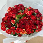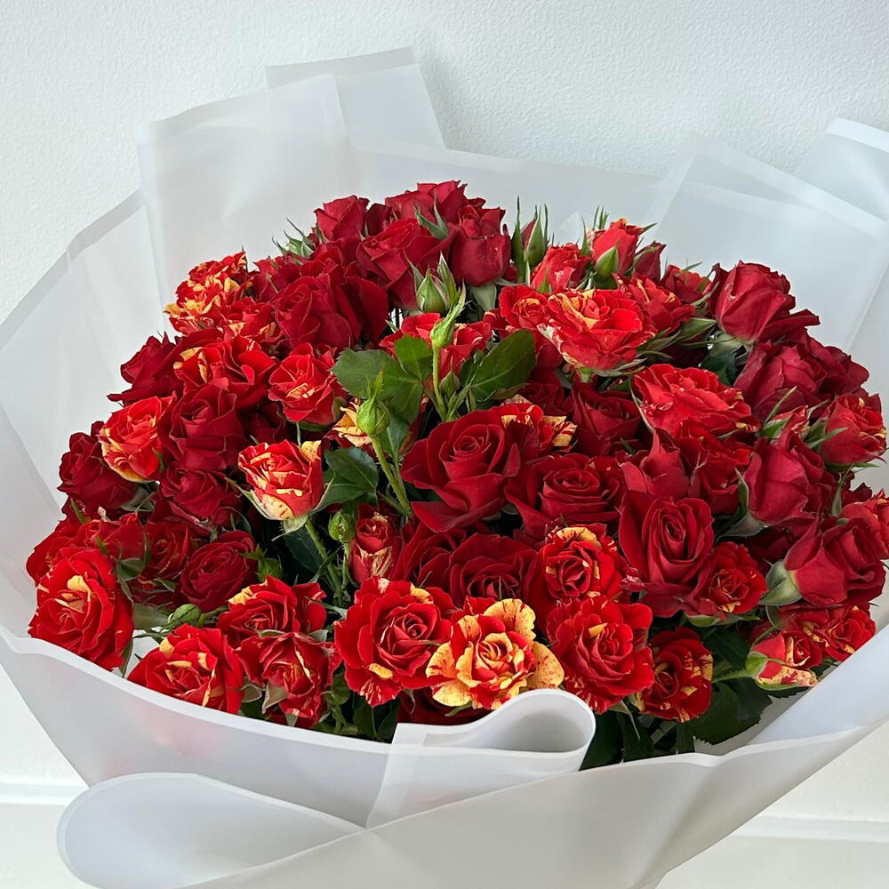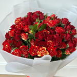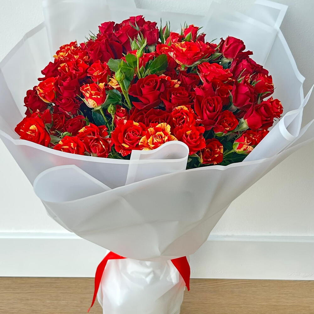 أضف البهجة إلى يوم شخص ما مع هذه الباقة الأنيقة والرائعة من الورود الحمراء والصفراء، التي تتميز بمزيج نابض بالحياة من الورود الحمراء الداكنة والورود ذات الأطراف الصفراء النارية. مثالية لأعياد الميلاد والذكرى السنوية ويوم الحب أو أي مناسبة خاصة. يتم لف تنسيق الزهور الطازجة هذا بشكل جميل بورق أبيض ناصع مع شريط أحمر، مما يجعله هدية مثالية للتعبير عن الحب والشغف والفرح. اطلب الآن للتوصيل السريع وأضف لمسة من الأناقة إلى هدايا الزهور الخاصة بك!