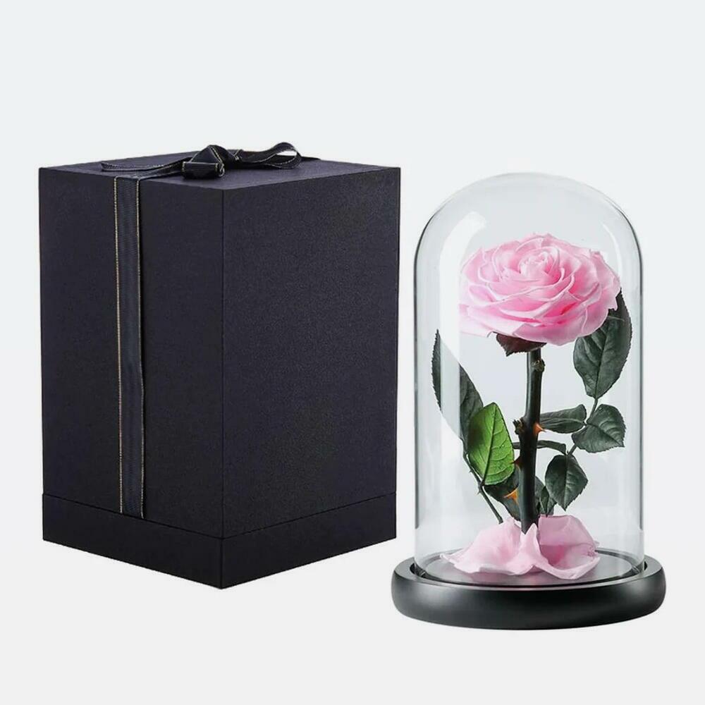 فازة بقبة زجاجية مع وردة مفردة - وردي فاتح
