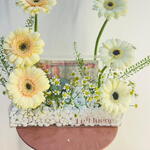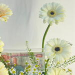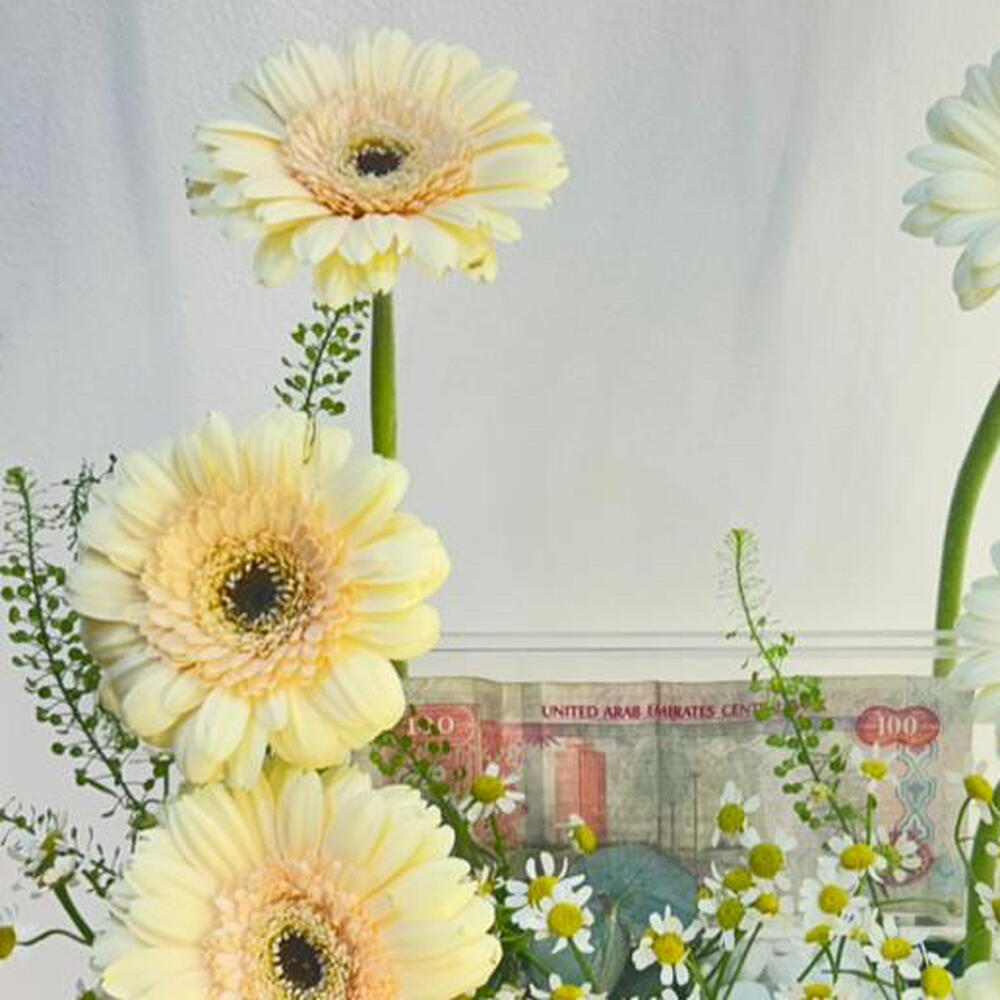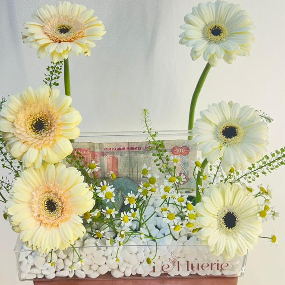 بابونج - 2 قطع جيربيرا بيضاء - 3 قطع حصالة نقود رفيعة بدون نقود - 1 قطع جيربيرا صفراء - 3 قطع