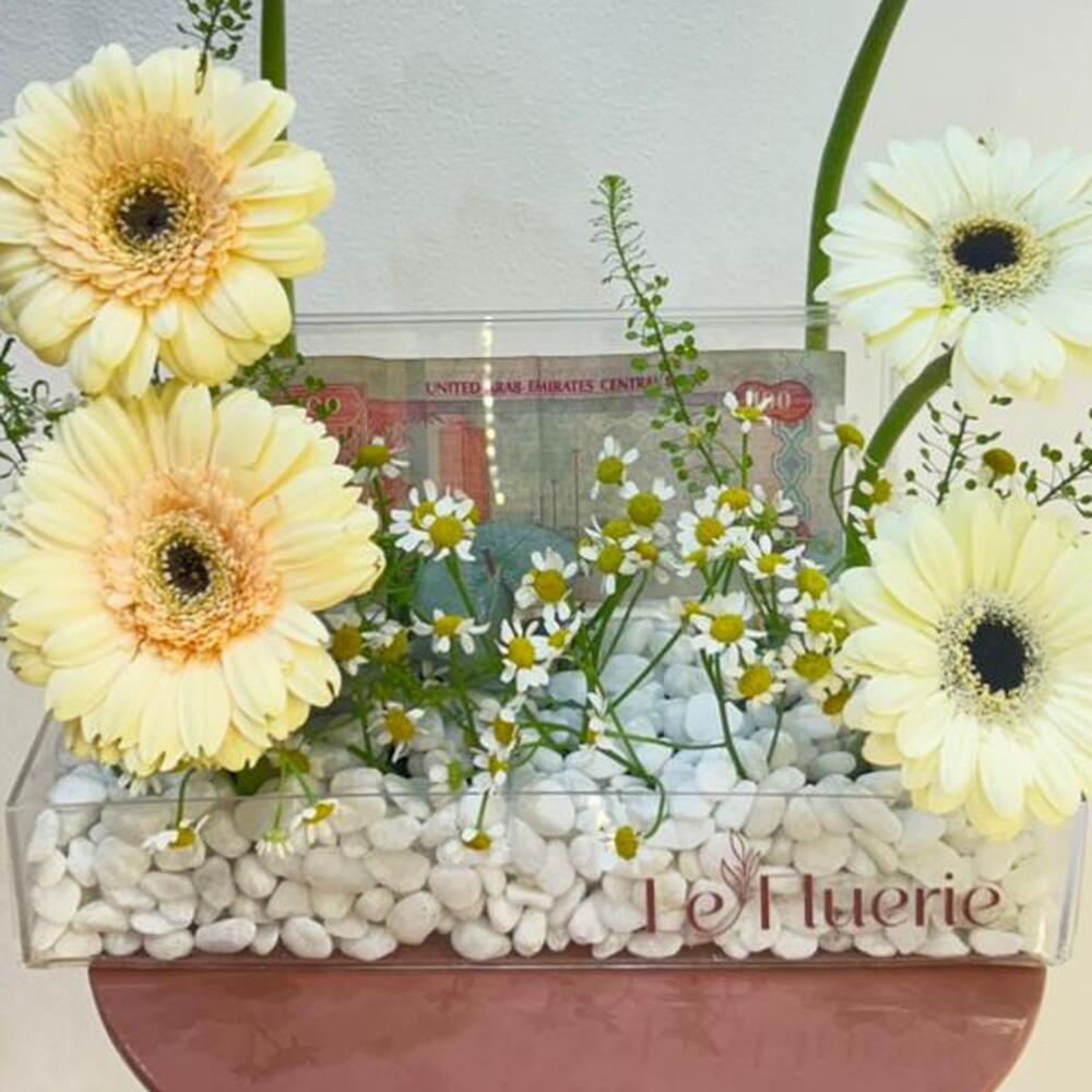 باقة زهور جربيرا ساحرة مع أزهار حشو رقيقة في صينية أكريليك مزينة بحصى بيضاء وحصالة نقود. مثالية للمناسبات الخاصة، عيد الفطر.