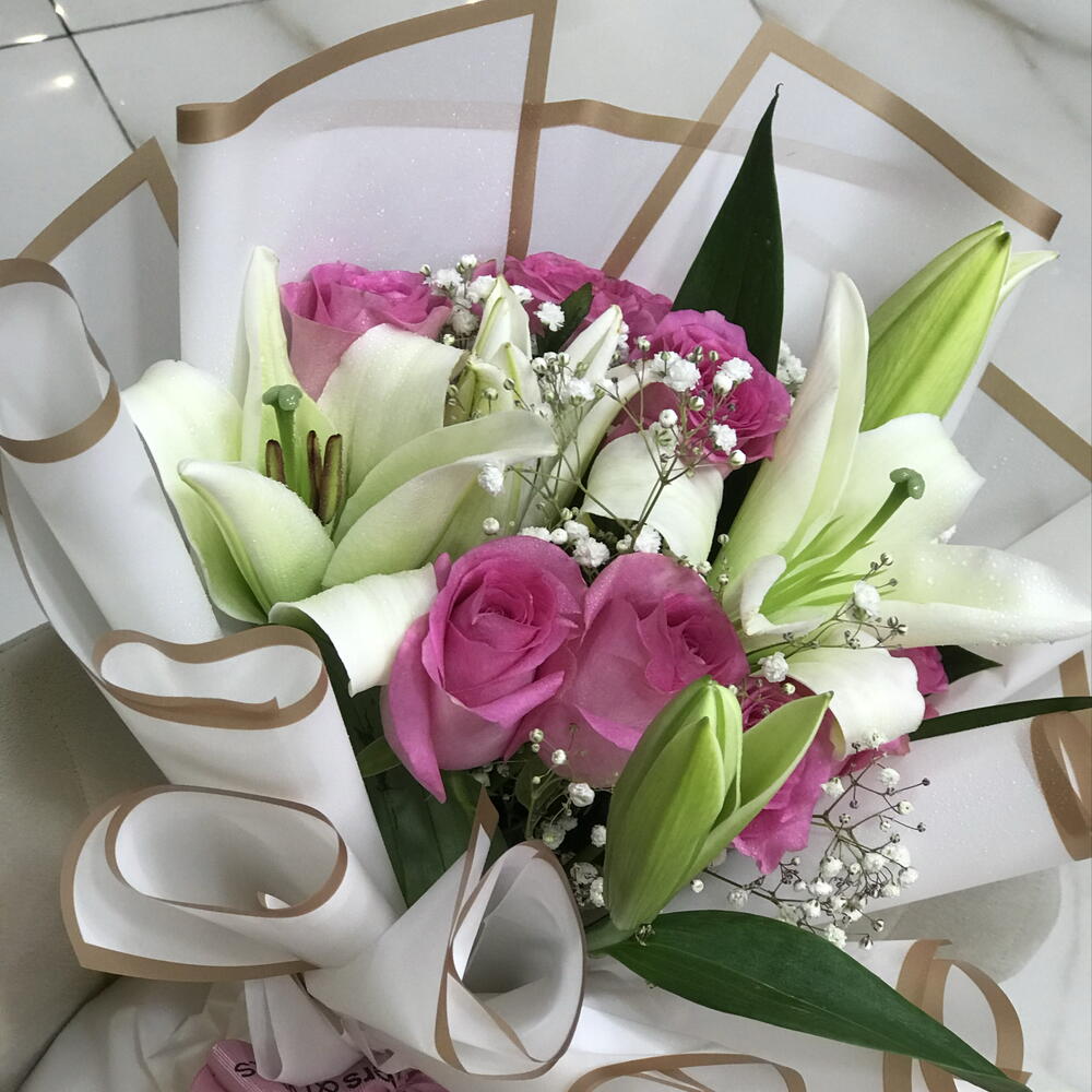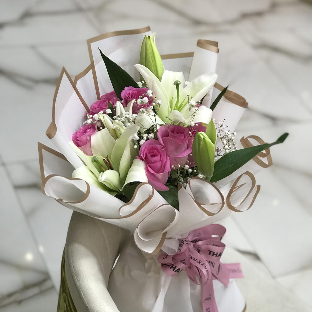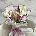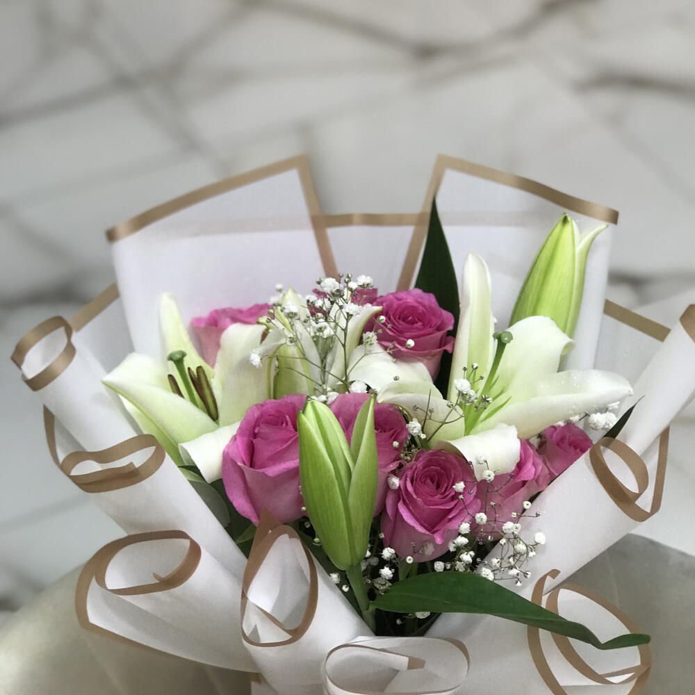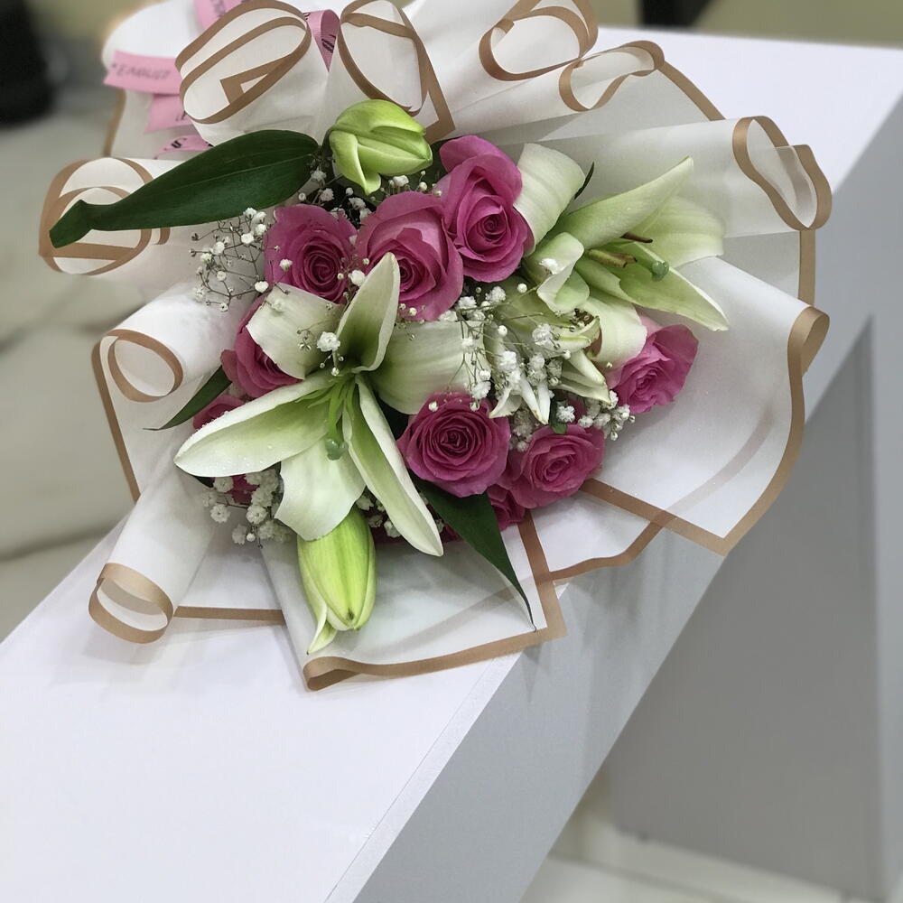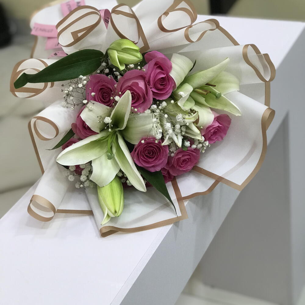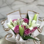 توليفة زنبق وورد – باقة وردية وبيضاء 1115