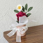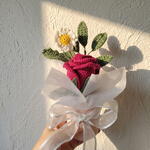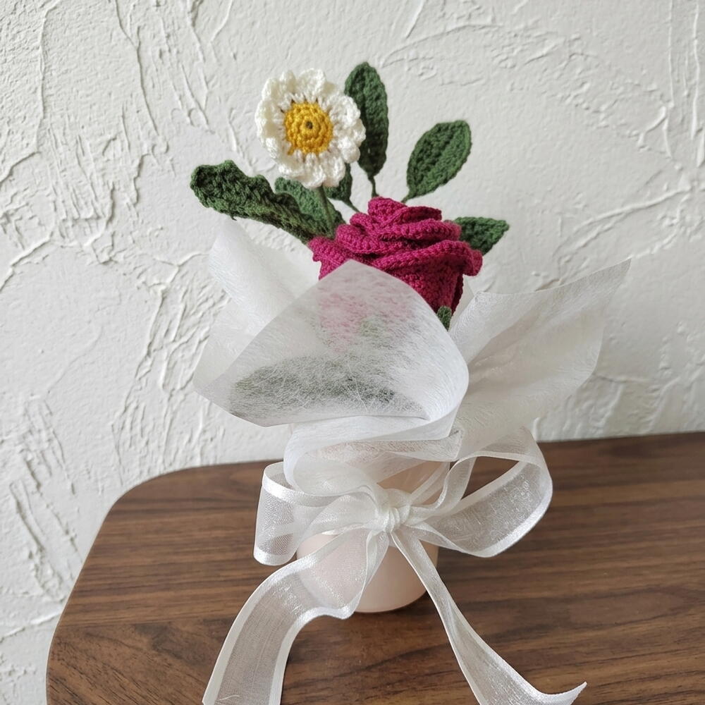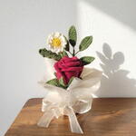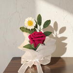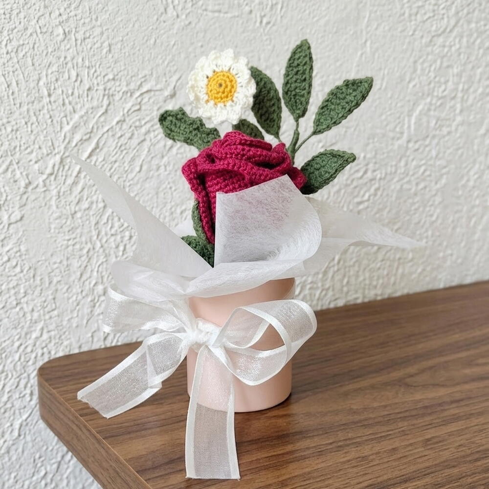 أضف لمسة من الأناقة الدافئة إلى مساحتك مع هذا الترتيب المحبوك يدويًا. يتميز بوردة قرمزية مخملية، وأقحوان صغير مبتهج، وأوراق خضراء مورقة، وهذه القطعة مثبتة بشكل دائم في مزهرية أسطوانية وردية باستيل ذات تصميم بسيط. الجمع الدقيق بين ملمسات خيوط عالية الجودة ولفافة أورجانزا بيضاء هوائية يخلق مظهرًا ناعمًا ورومانسيًا لا يحتاج إلى سقي أبدًا. الميزات الرئيسية جاهز للعرض: على خلاف الباقات المتفرقة، يأتي هذا مُرتبًا مسبقًا في قاعدة وردية متينة وأنيقة. حرفة يدوية: لاحظ تفاصيل الغرز المعقدة على بتلات الوردة — مصممة لتقليد الانحناءة الطبيعية للزهرة المتفتحة. الحجم المثالي: صغير بما يكفي لمكان العمل أو طاولة السرير أو رف ضيق. هدية صديقة للبيئة: بديل مستدام للزهور البلاستيكية أو الأزهار الطازجة قصيرة العمر.