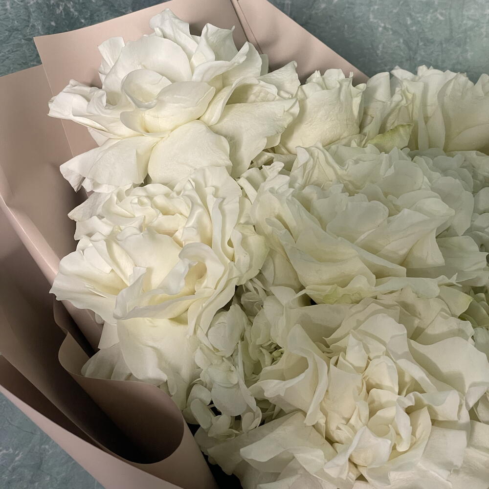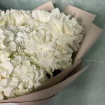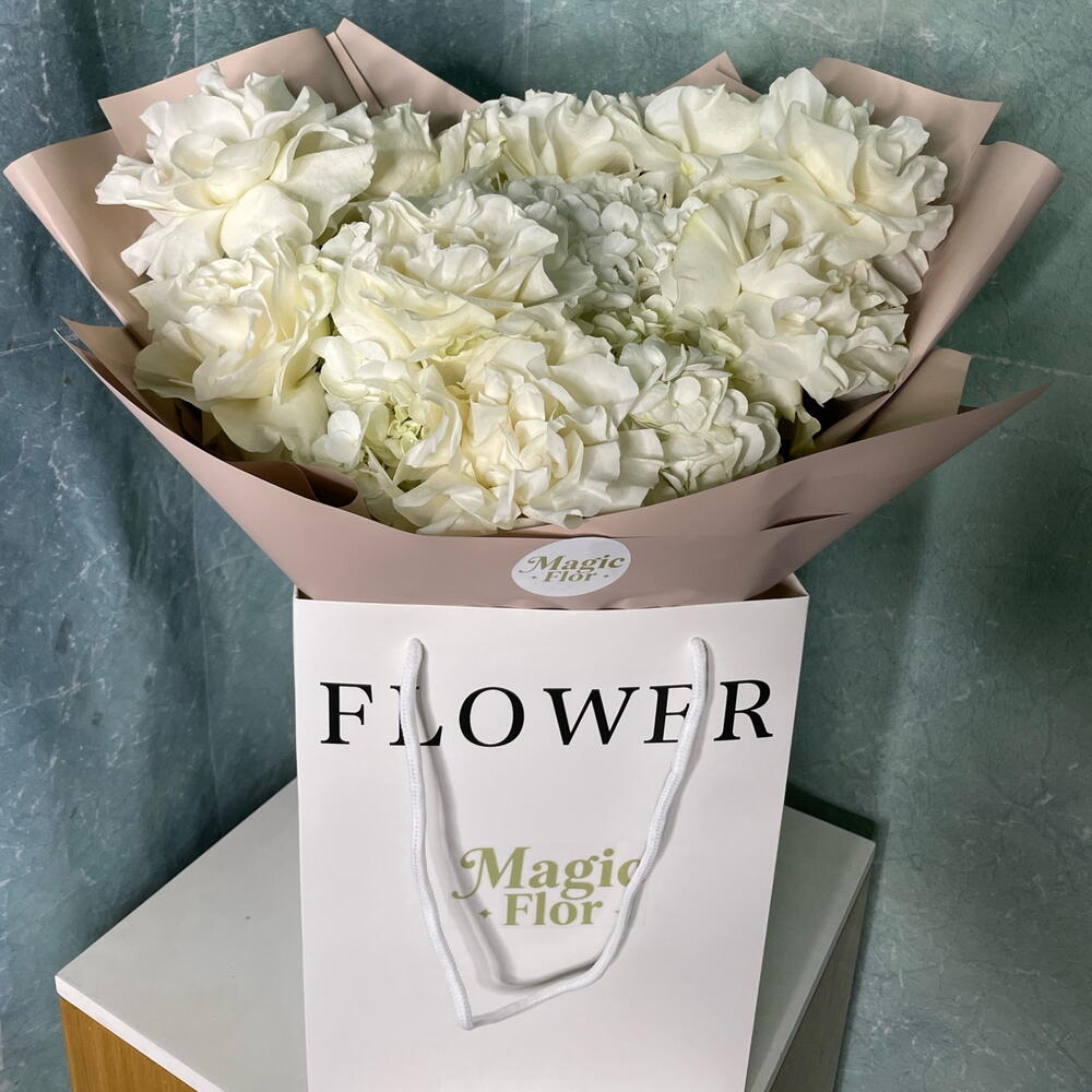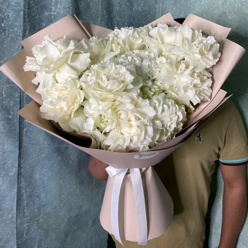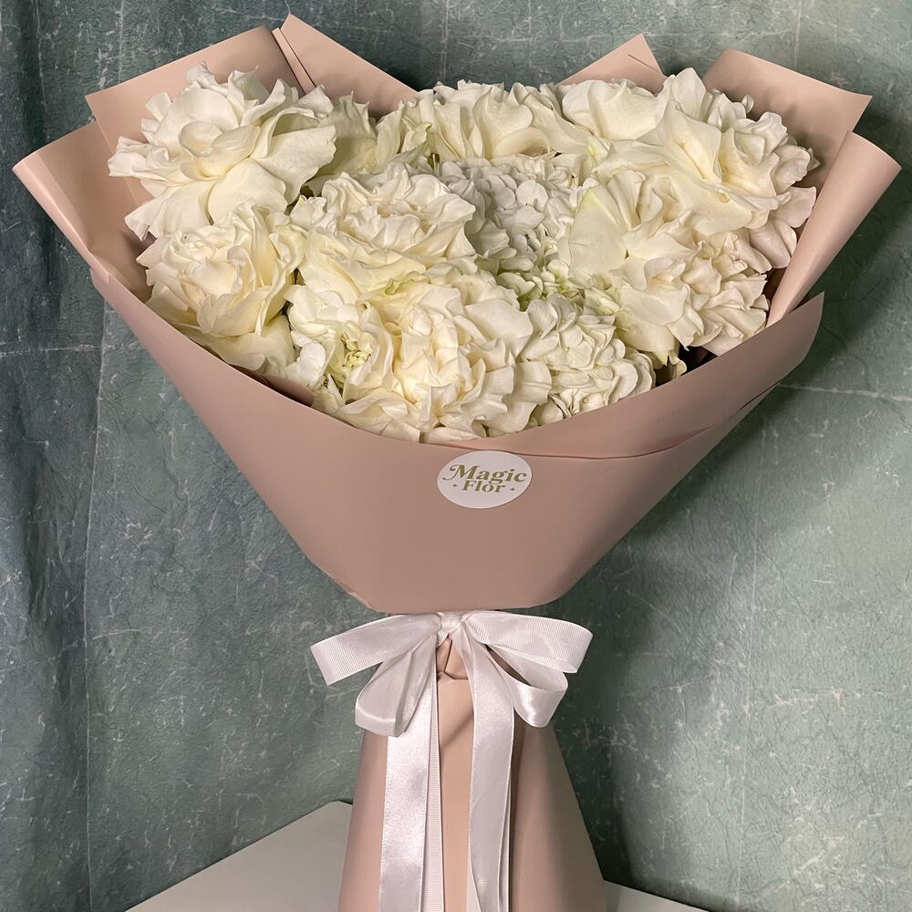 باقة أنيقة تضم ثلاث زهور هيدرانجيا بيضاء مع تسع ورود مونستون بيضاء، مُنسقة ببراعة لإطلالة خالدة وراقية. ترمز هذه الباقة الفاخرة من الزهور البيضاء إلى النقاء والأناقة، مما يجعلها مثالية لحفلات الزفاف، والذكرى السنوية، وأعياد الميلاد، أو كهدية راقية. مثالية لتزيين المنزل أو المناسبات الخاصة، بلمسة نهائية ناعمة وفاخرة تترك انطباعًا لا يُنسى. 🤍🌸
