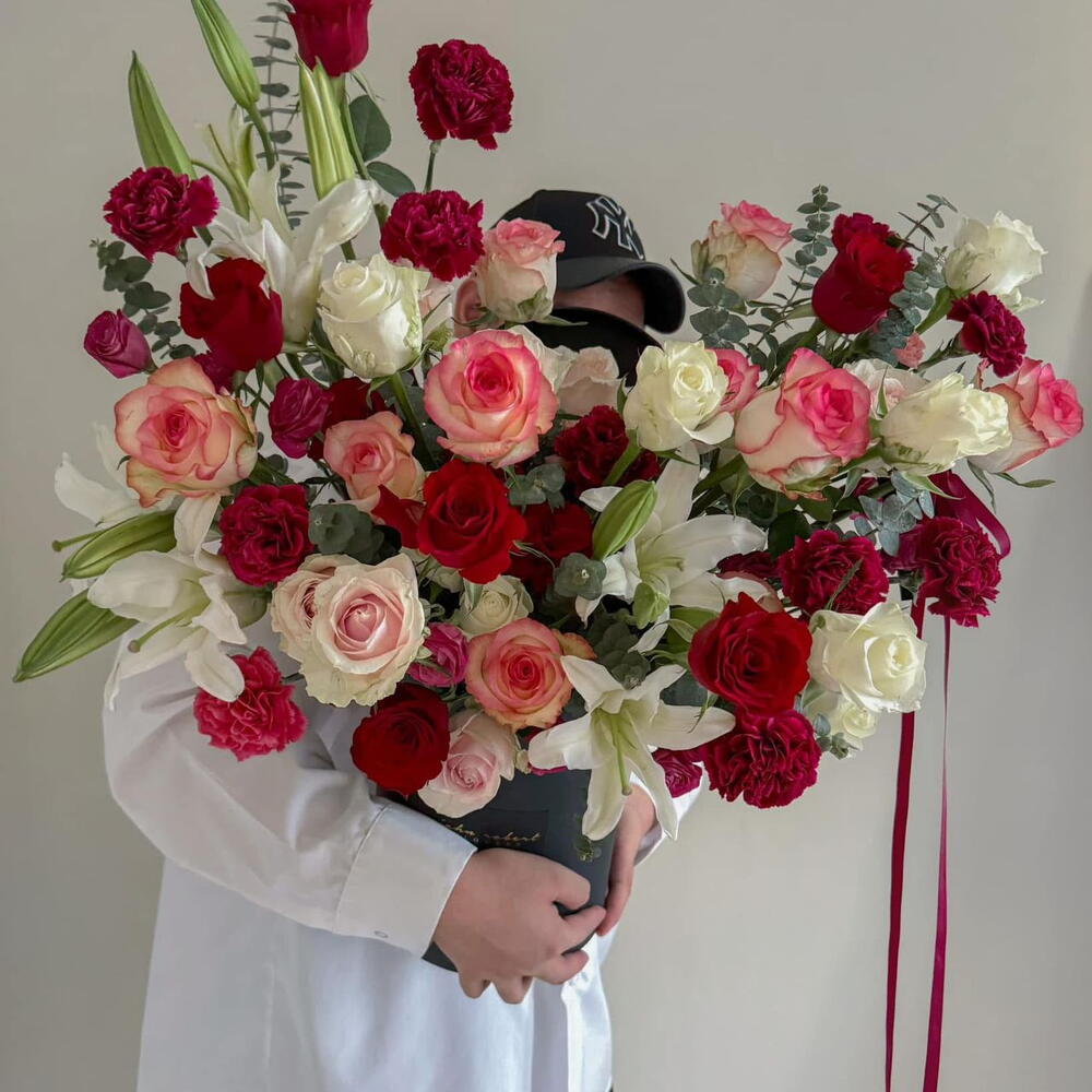 أوكالبتوس - 5 قطع وردة وردية - 3 قطع زنبق أبيض - 3 قطع أحمر قرنفلي - 9 قطع ورود حمراء فاخرة - 7 قطع جميلة وردية - 9 قطع ليزيانثوس وردي فاقع - 5 قطع