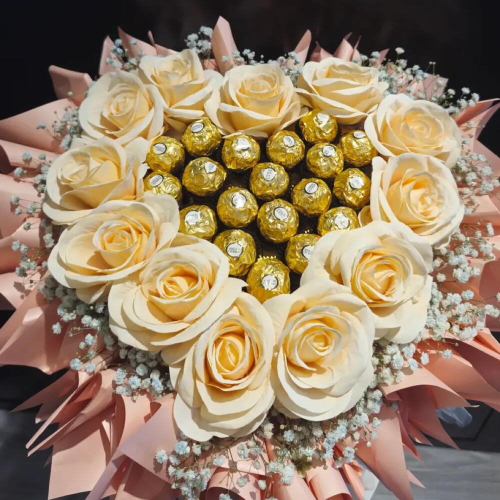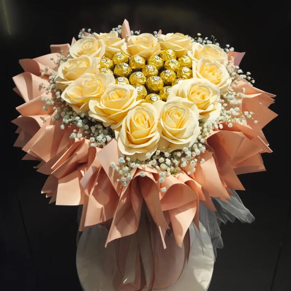 تتميز هذه الباقة الاستثنائية من زهور الشوكولاتة بتشكيلة رائعة من 12 وردة كريمية اللون، مُزينة بـ 20 قطعة شهية من شوكولاتة فيريرو روشيه. تُقدم الباقة في ورق تغليف أنيق بلون الخوخ، ومُزينة بشريط أبيض وخوخي، ومُغلفة بشبكة بيضاء رقيقة. تعد هذه الباقة متعة بصرية ولذيذة، مثالية لأي مناسبة خاصة.