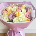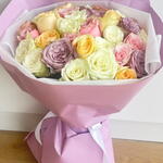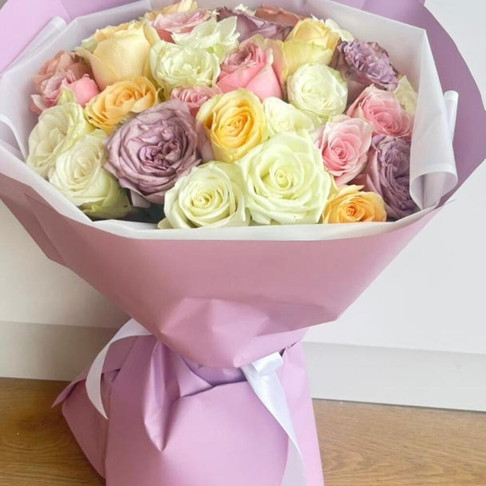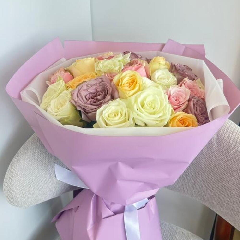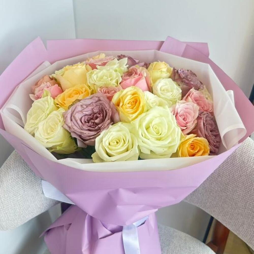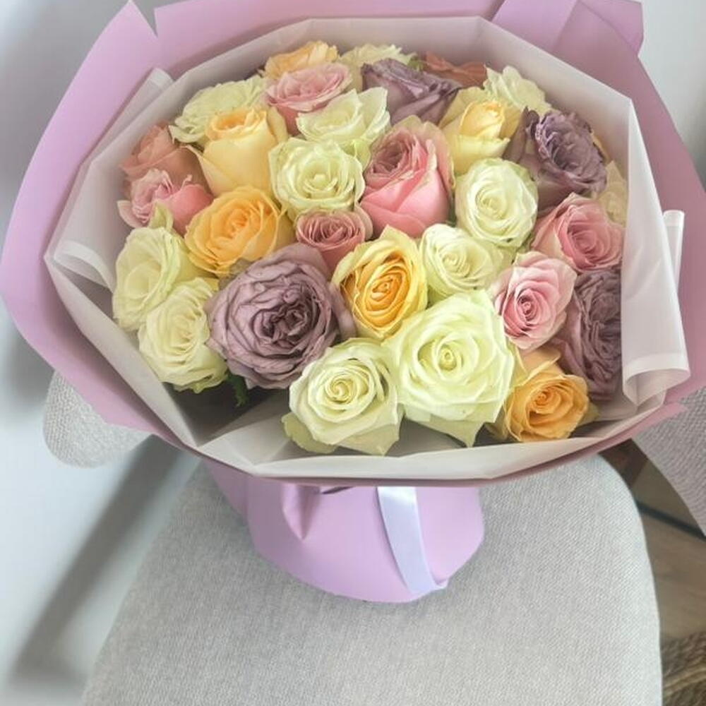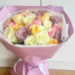 استمتع بجمال هذه الباقة الفاخرة من الورود المختلطة، التي تضم مزيجًا رائعًا من الورود باللون الوردي الفاتح، والأبيض الكريمي، والخوخي، والأصفر، واللافندر. مثالية لأعياد الميلاد أو الذكرى السنوية أو لمجرد إضاءة يوم شخص ما، فتنسيق الزهور الطازجة الفاخر هذا ملفوف بورق بنفسجي وأبيض رقيق ومربوط بشريط أبيض جذاب. مثالية للإهداء أو لتزيين المنزل، تضفي هذه الباقة لمسة من الأناقة والدفء على أي مناسبة. اطلب الآن هدية زهرية خالدة تعبّر عن الكثير!