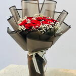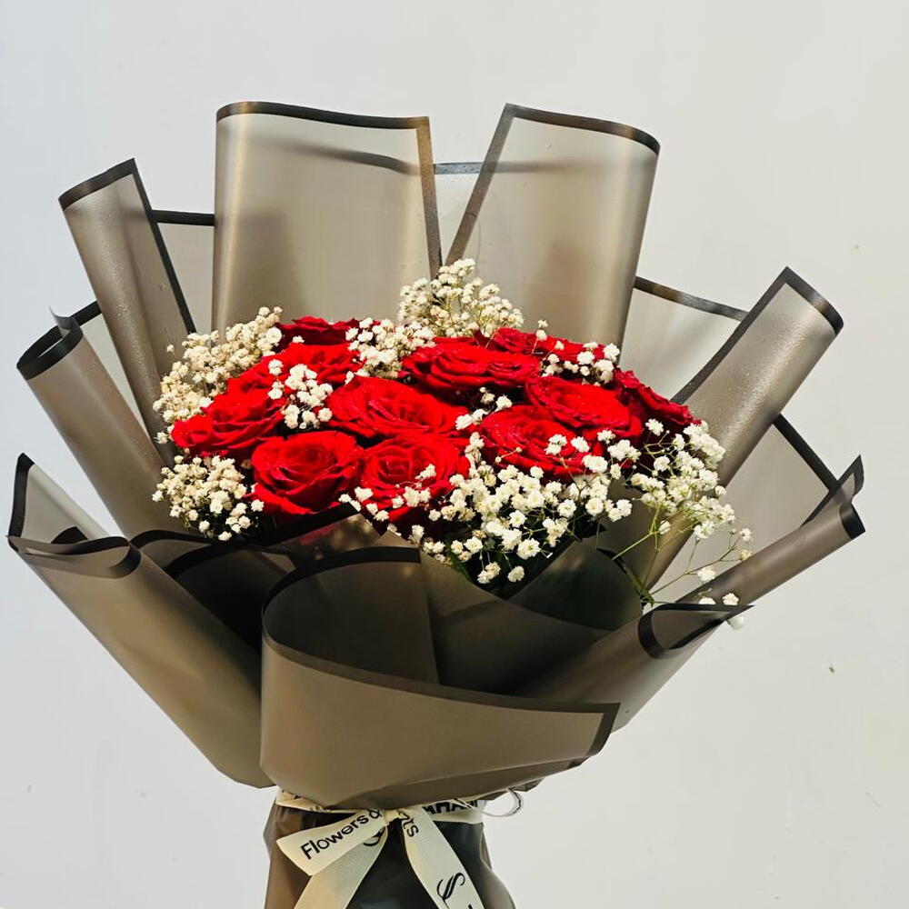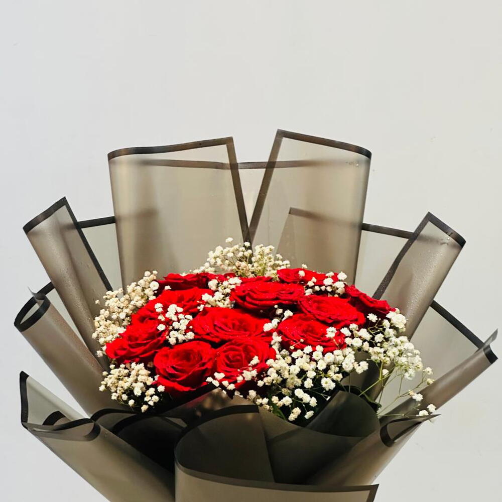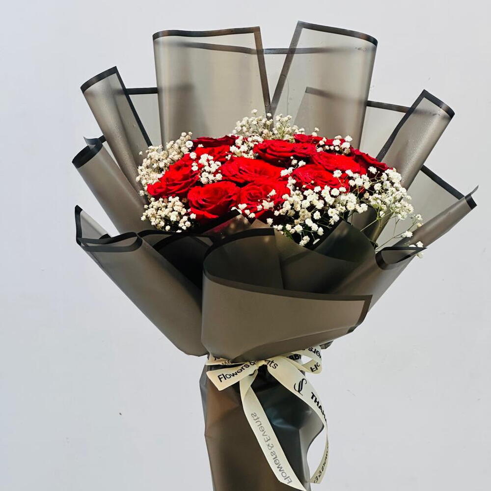 تتميز هذه الباقة بورود حمراء مخملية فاخرة تتوسطها باقة رقيقة من زهور الجيبسوفيلا البيضاء. تم تغليف الباقة ببراعة بورق عصري شفاف مقاوم للماء بلون أسود دخاني، مما يبرز اللون الأحمر النابض بالحياة للورود. مزينة بشريط ثهابي المميز، تُعد هذه الباقة الهدية الأمثل للتعبير عن مشاعر عميقة، أو الاحتفال بذكرى سنوية، أو مفاجأة شخص عزيز.