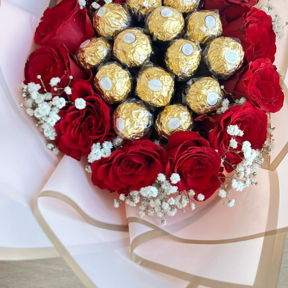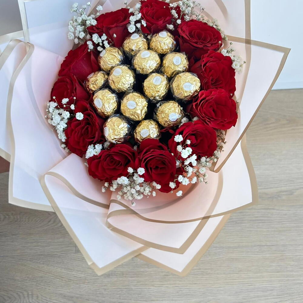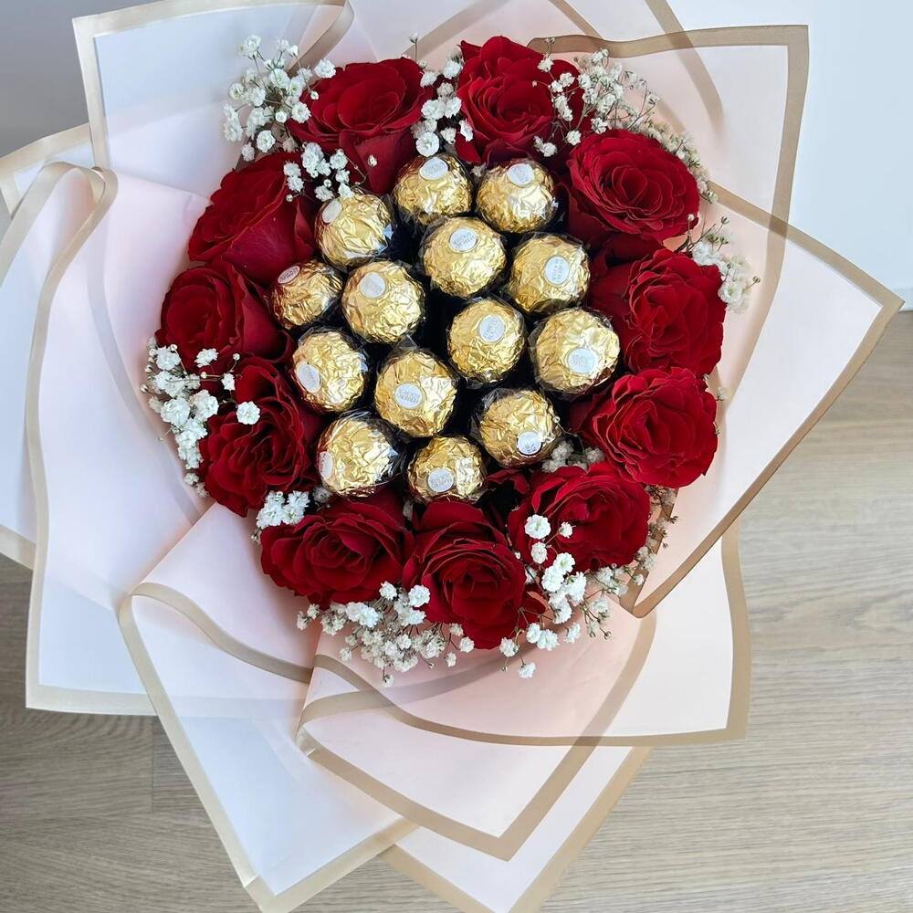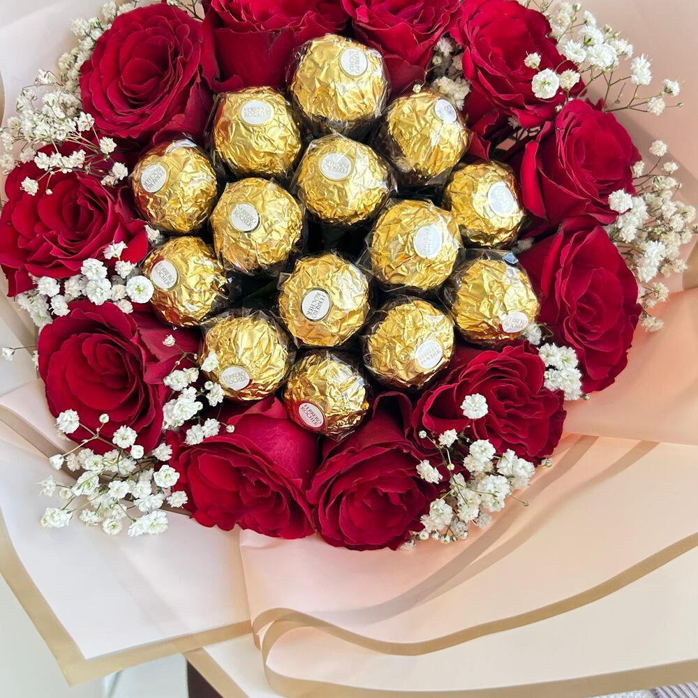 وردة حمراء - 11 قطع فيريرو روشيه - 14 قطع جيبسوفيلا - 2 قطع