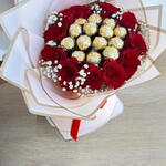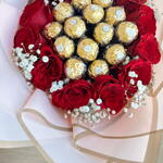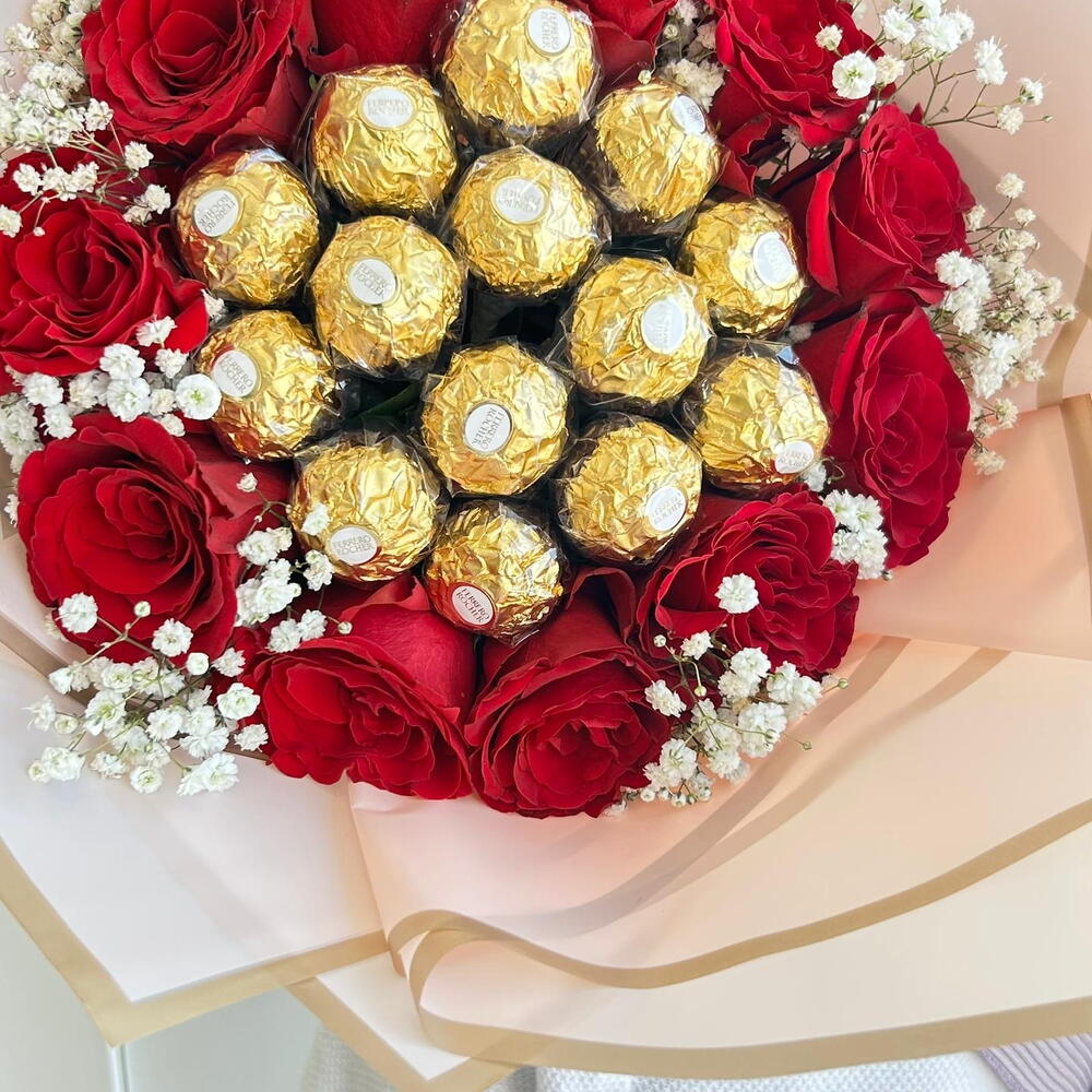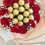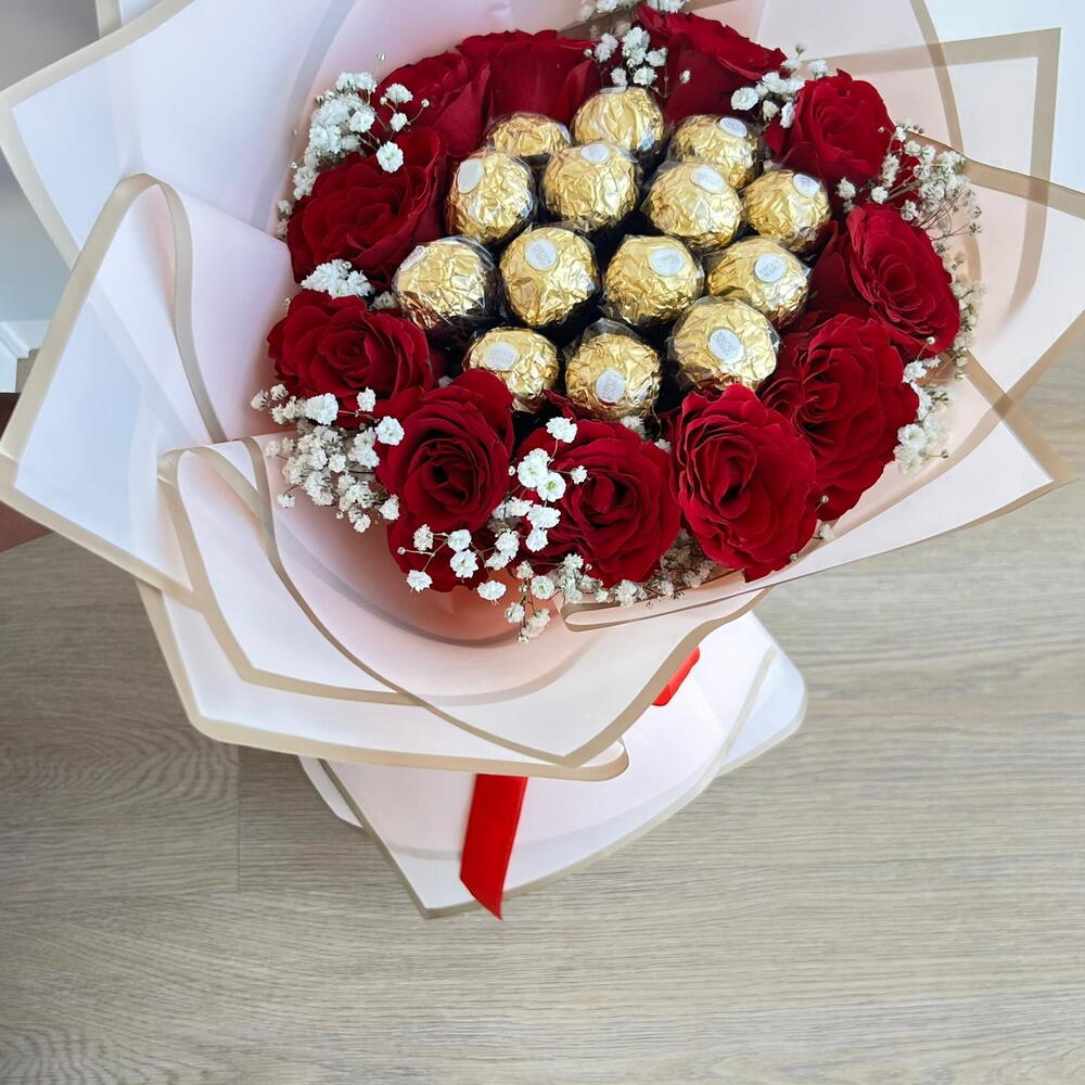 اجعل كل مناسبة لا تُنسى مع باقتنا اليدوية المذهلة التي تضم ورودًا حمراء فاخرة مصحوبة بشوكولاتة فيريرو روشيه الشهية. مغلفة بورق ناعم أنيق بلون زهري باهت مع شريط أحمر.