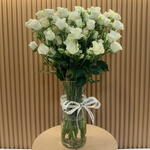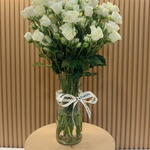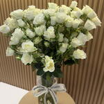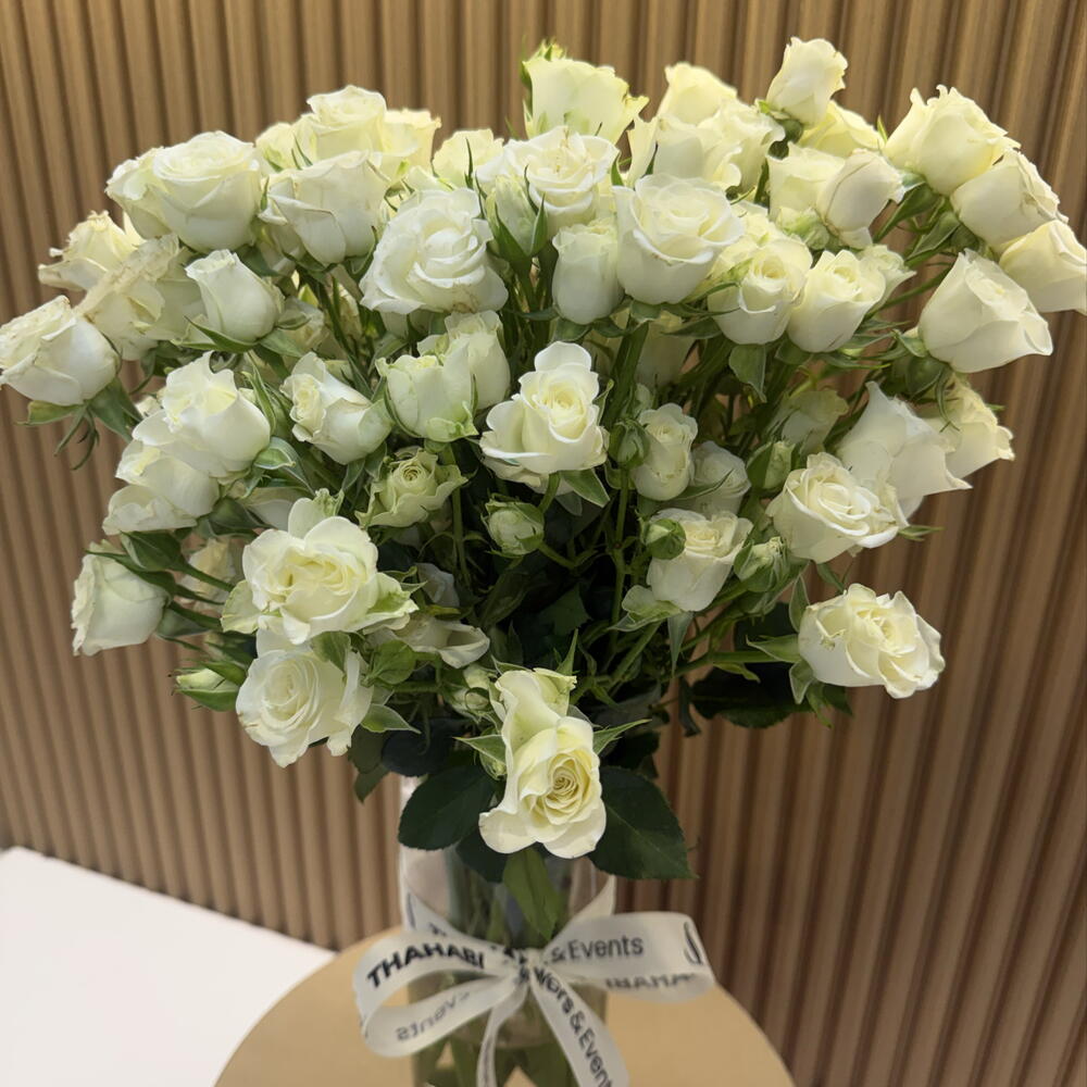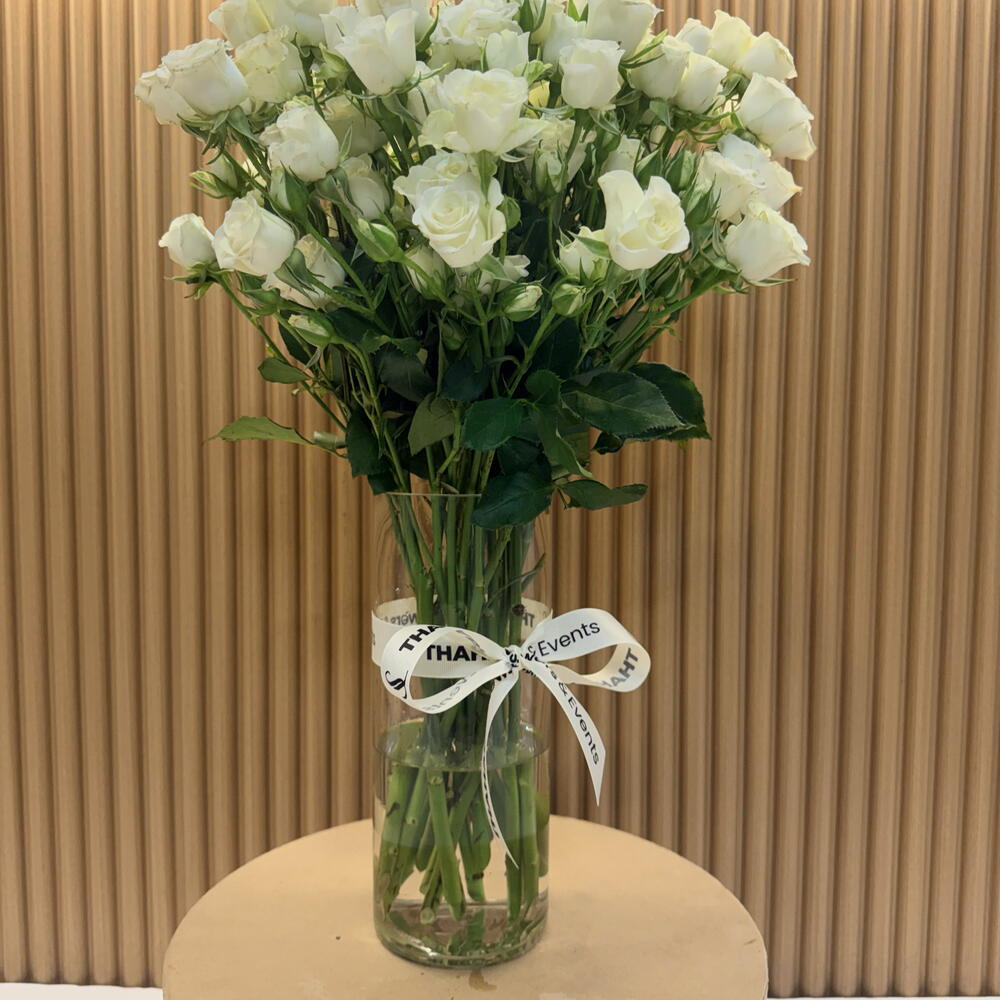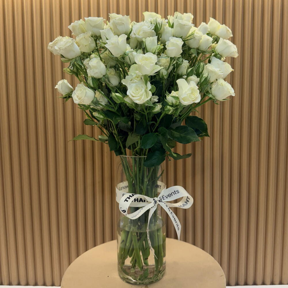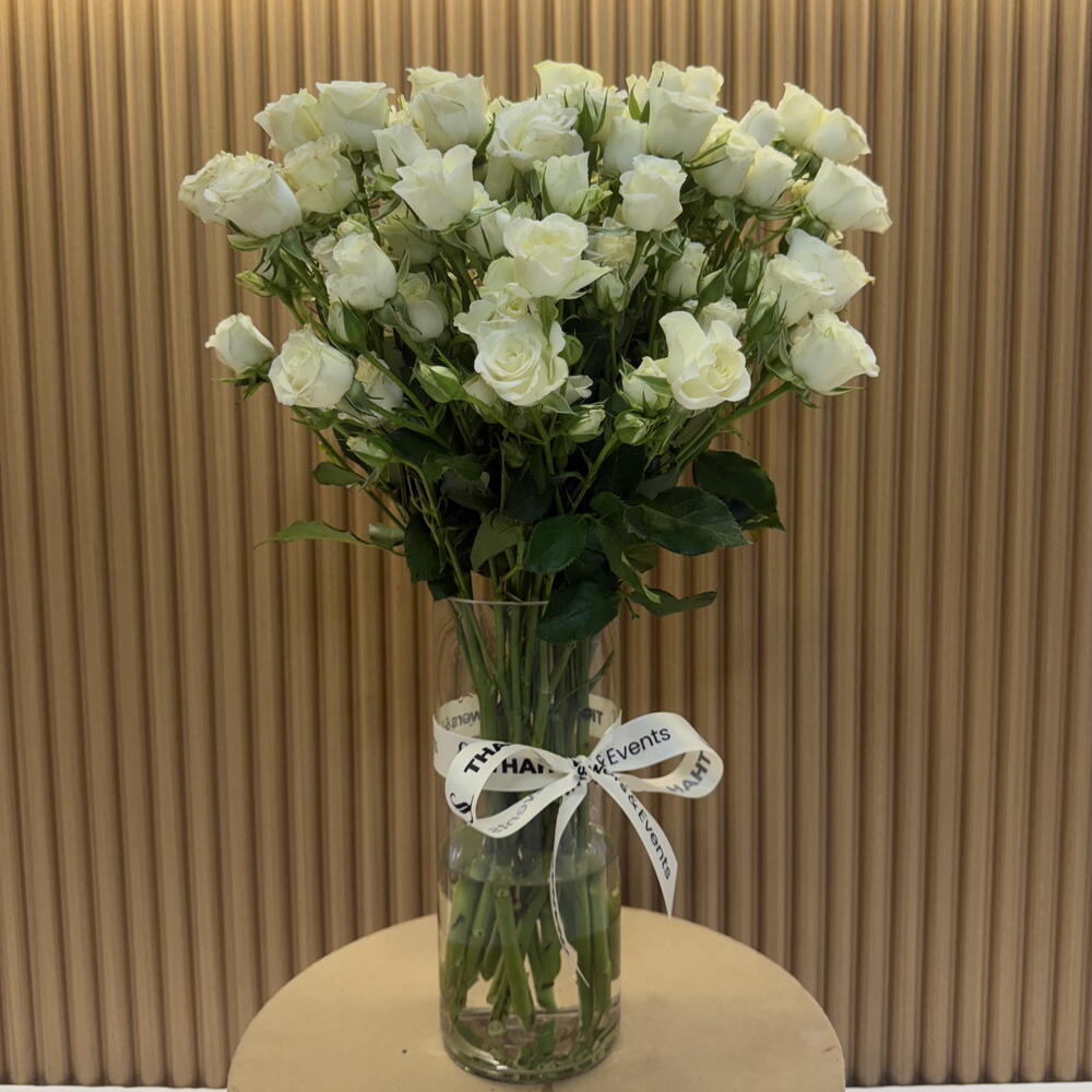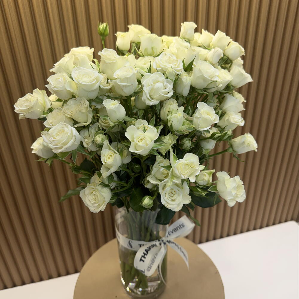 عرض أنيق من ورود سبراي بيضاء طازجة مقدمة في أسطوانة زجاجية أنيقة. هذا التنسيق الخالد مثالي لديكور المنزل أو لمكاتب العمل أو كهدية مدروسة تضيف لمسة من الصفاء إلى أي غرفة. العناية اليومية لجمال يدوم الماء النظيف هو الأساس: غيّر الماء في المزهرية كل 24–48 ساعة لمنع نمو البكتيريا، التي قد تتسبب في ذبول الزهور مبكرًا. حافظ على النظافة: اغسل المزهرية جيدًا بالصابون والماء كلما غيرت السائل للحفاظ على بيئة معقمة. القصّة المثالية: كل يومين، قَصّ حوالي 1–2 سم من السيقان بزاوية 45 درجة. هذا يزيد من مساحة السطح لامتصاص الماء ويمنع السيقان من الجلوس مستوية على قاع المزهرية.
