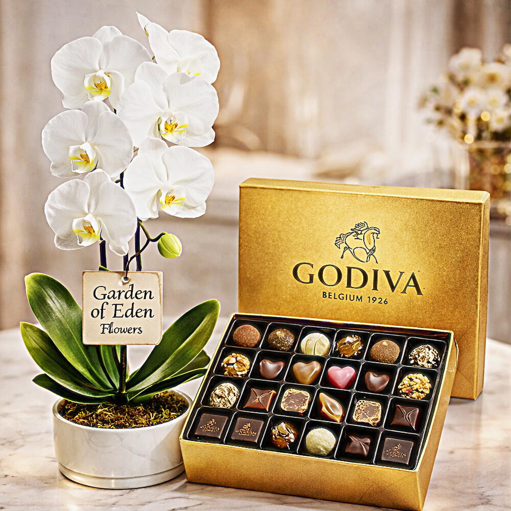 علبة شوكولاتة جوديفا (40 قطعة) - 1 قطع نبتة أوركيد فالاينوبسيس بيضاء - 1 قطع