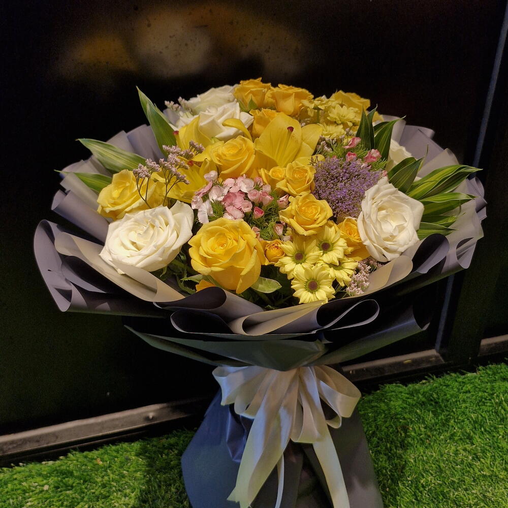 زهور الشمع - 4 قطع زنابق صفراء - 3 قطع أوراق جامايكا - 4 قطع ورود بيضاء - 5 قطع ورود صفراء - 5 قطع