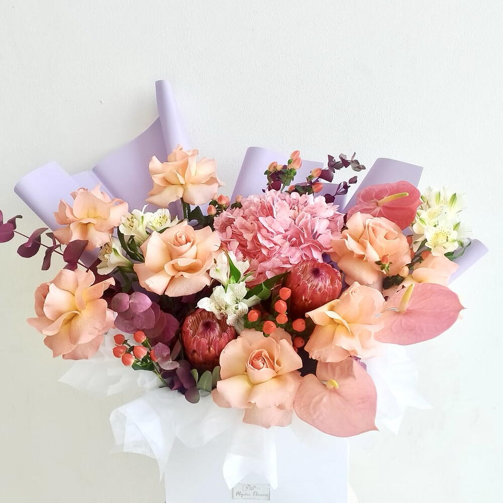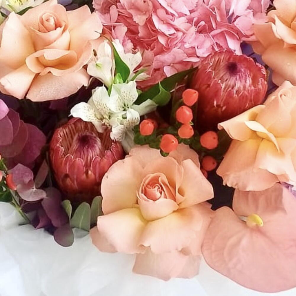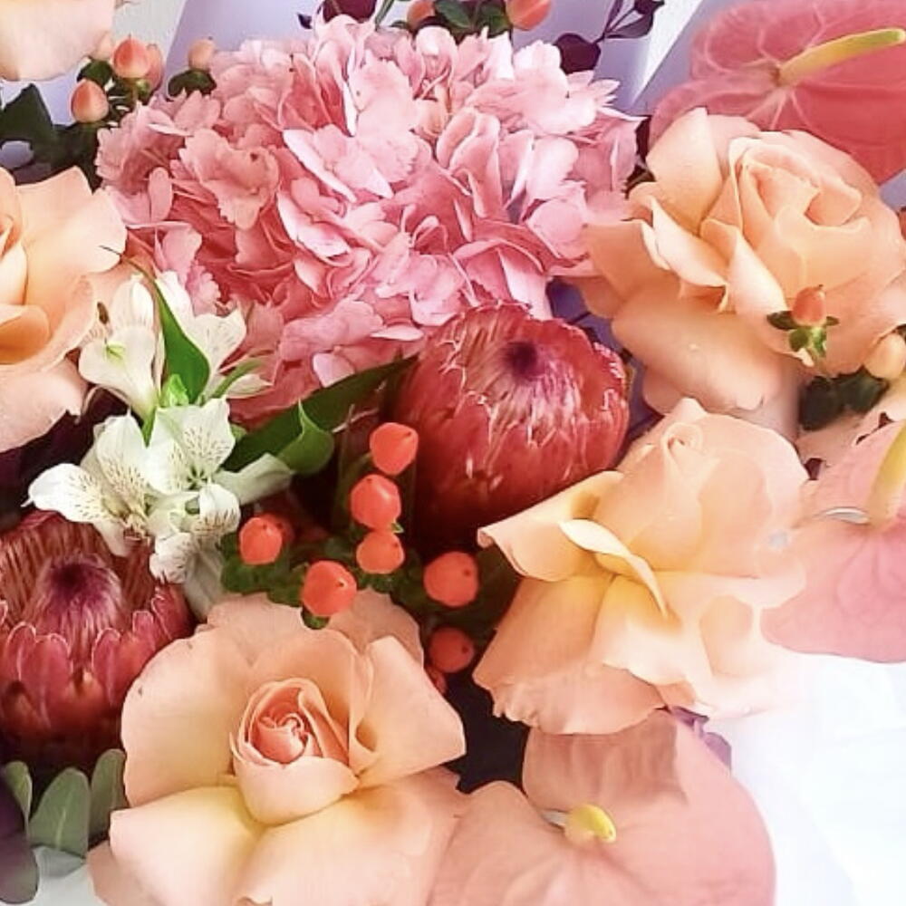 ألستروميريا بيضاء - 3 قطع هيدرنجيا وردية - 1 قطع وردة جميلة - 7 قطع بروتيا - 2 قطع توت الهيبيريكوم - 5 قطع كيس ورقي - 1 قطع أنتوريوم زهري - 3 قطع