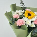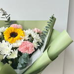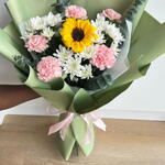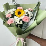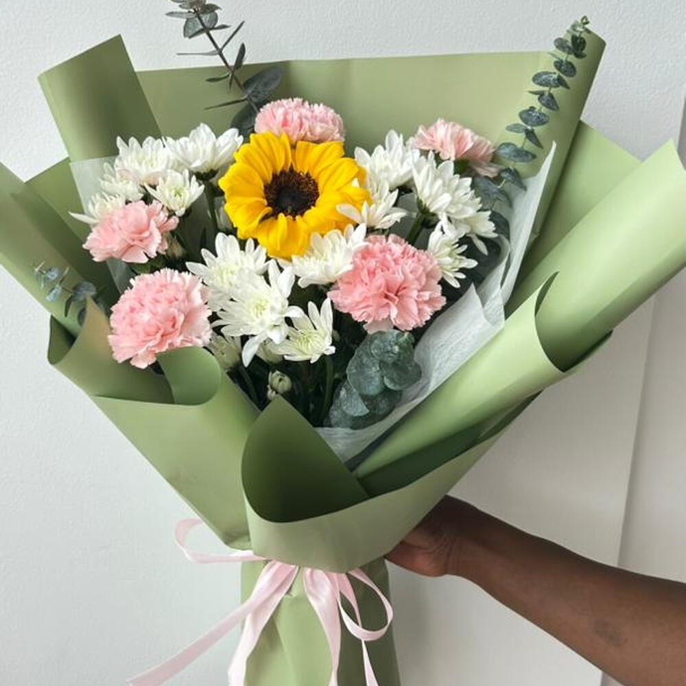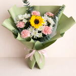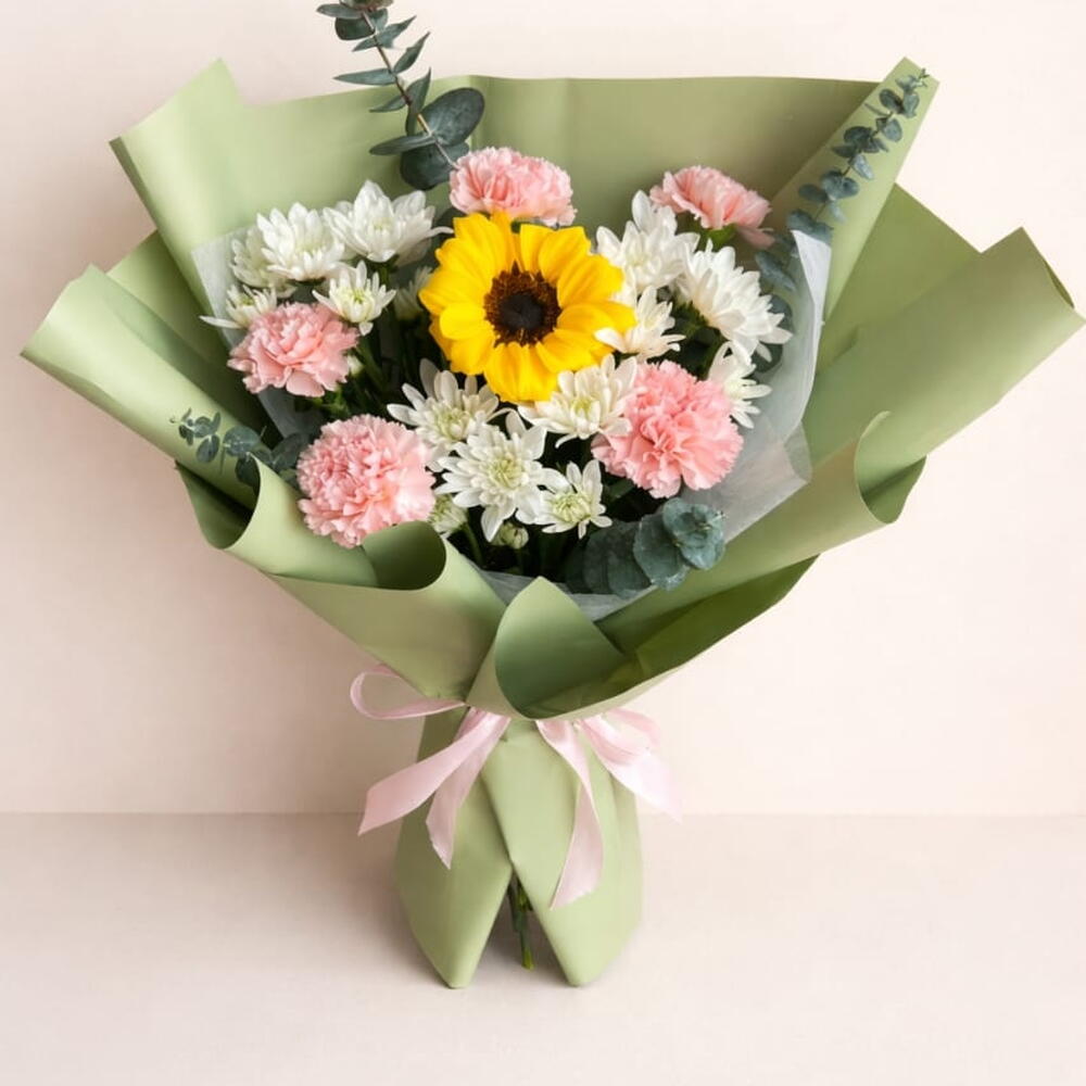 أضفِ البهجة إلى أي مناسبة مع باقة زهور "سانشاين ديلايت" المتنوعة، والتي تتميز بقطعة مركزية من زهور عباد الشمس النابضة بالحياة، محاطة بأزهار القرنفل الوردية الرقيقة وأزهار الأقحوان البيضاء النضرة. مغلفة بورق أخضر أنيق ومربوطة بشريط وردي ناعم. هذه الباقة مثالية كهدية عيد ميلاد، أو لفتة رومانسية، أو احتفال، أو تمنيات بالشفاء العاجل، أو حتى كمفاجأة يومية.