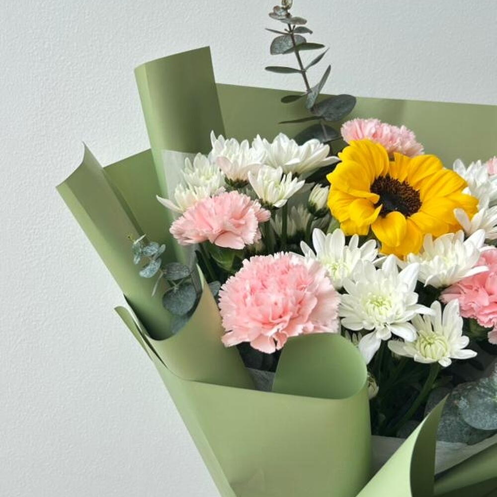 أوكالبتوس - 4 قطع دوار الشمس - 1 قطع أقحوان أبيض - 3 قطع قرنفل وردي - 5 قطع