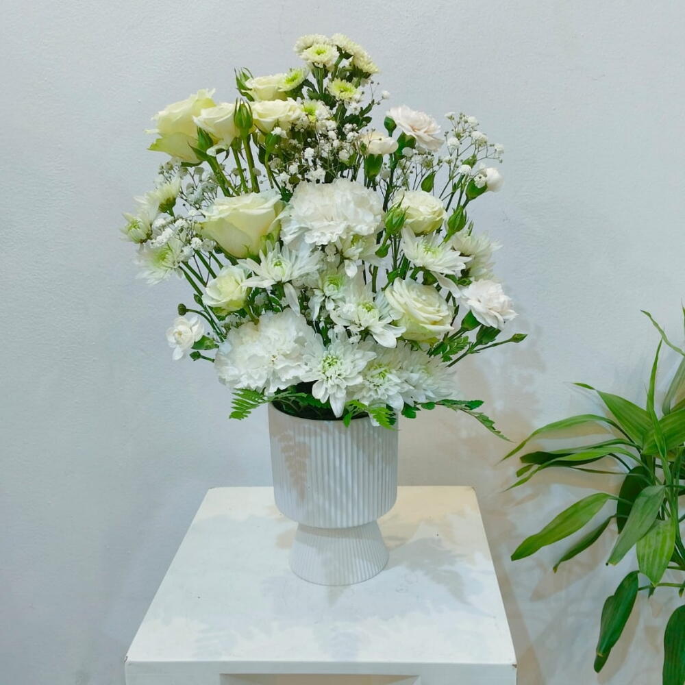 وردة بيضاء - 3 قطع جيبسوفيلا - 5 قطع أقحوان أبيض - 7 قطع أوراق - 3 قطع قرنفل أبيض - 4 قطع وردة بيبي بيضاء - 7 قطع