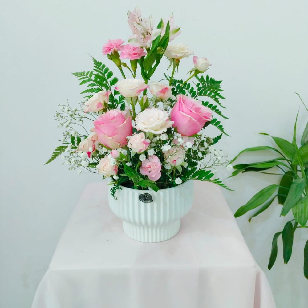 جيبسوفيلا - 5 قطع زهري وردي - 2 قطع قرنفل وردي - 2 قطع سرخس جلدي - 3 قطع ريفلكس وردة صغيرة - 11 قطع