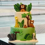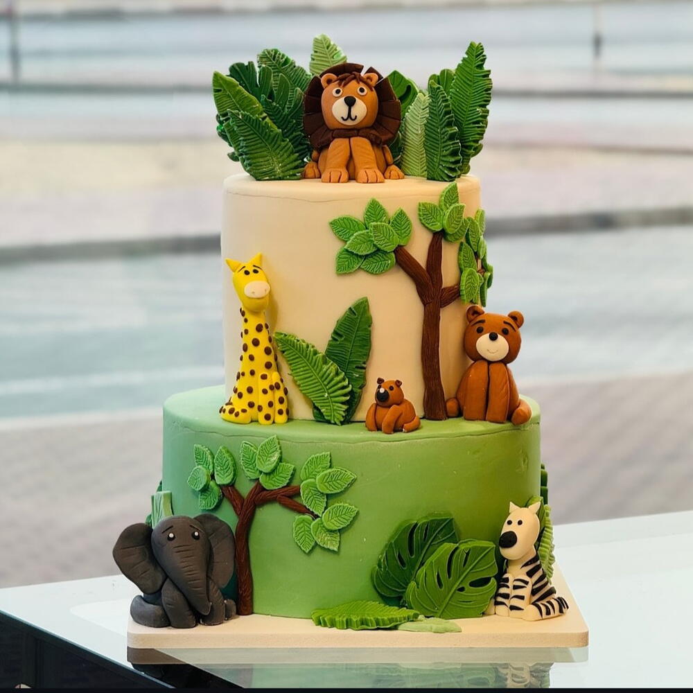 This is a fantastic two-tiered safari or jungle-themed cake, likely designed for a childs birthday. Design and Structure Tiers: It has two tiers of different sizes. The bottom tier is wider and covered in a cheerful medium-green frosting, representing the jungle floor or dense foliage. The top tier is slightly narrower and covered in a smooth, light cream or ivory colored frosting. Aesthetics: The entire cake is highly detailed with edible fondant figures and leaves, creating a vibrant 3D scene. Decorations and Figures The cake is populated with several adorable, sculpted fondant safari animals: Top Tier: A seated Lion figure is positioned right on top, surrounded by large, vibrant green leaves that frame the animal like a mane or dense canopy. Bottom Tier: A yellow Giraffe with brown spots is standing on the left side. A brown Bear is seated on the right side. A small, dark Elephant is situated near the base on the left. A striped Zebra is positioned near the base on the right. A small cub (likely a bear or lion cub) is nestled between the giraffe and the bear. Foliage: Edible trees with brown trunks and bright green leaves, along with large, sculpted tropical leaves (like monstera leaves and fern fronds), are carefully placed on both tiers to enhance the jungle environment. It’s a perfect centerpiece cake for a baby shower or a first birthday party with an animal theme!