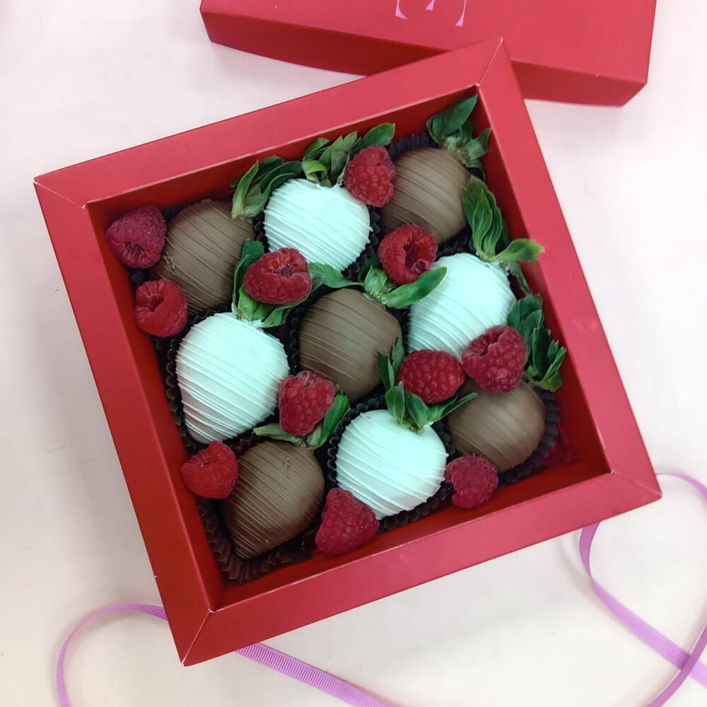 5 Belgian milk chocolate covered strawberries 4 Belgian white chocolate covered strawberries 11 fresh raspberries