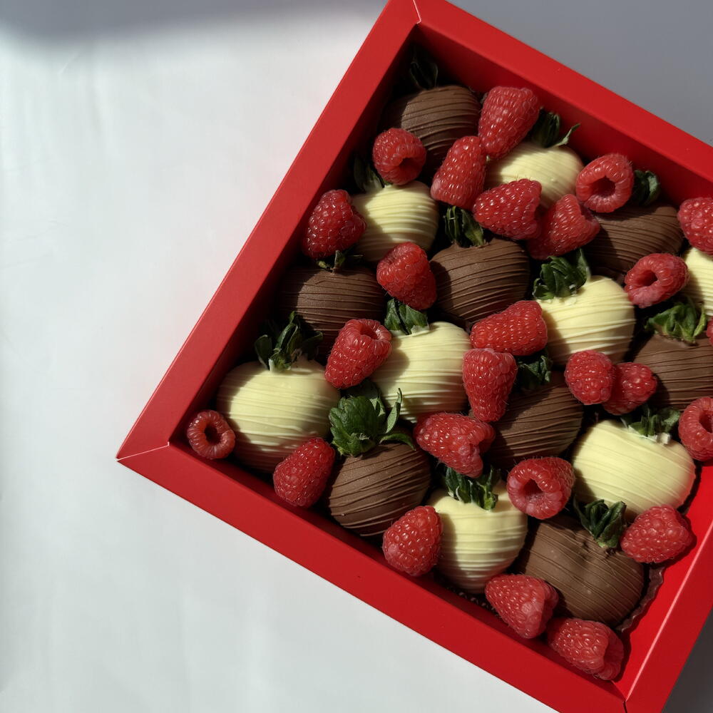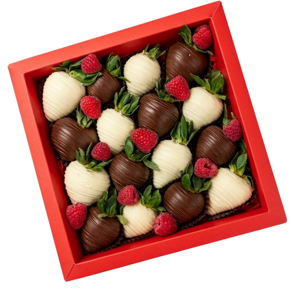 A box of hand-dipped strawberries covered in a mix of Belgian milk and white chocolate, topped with delicate chocolate stripes and fresh raspberries. A sweet surprise that feels both classic and thoughtful.