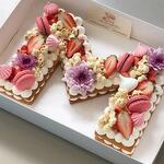 It's a fluffy & moist vanila base. In layers we add condensed milk filling with roasted almonds. It's M theme for mothers day. Macrons, flowers, strawberries, choclates are added on top of the cake to make more beautiful.