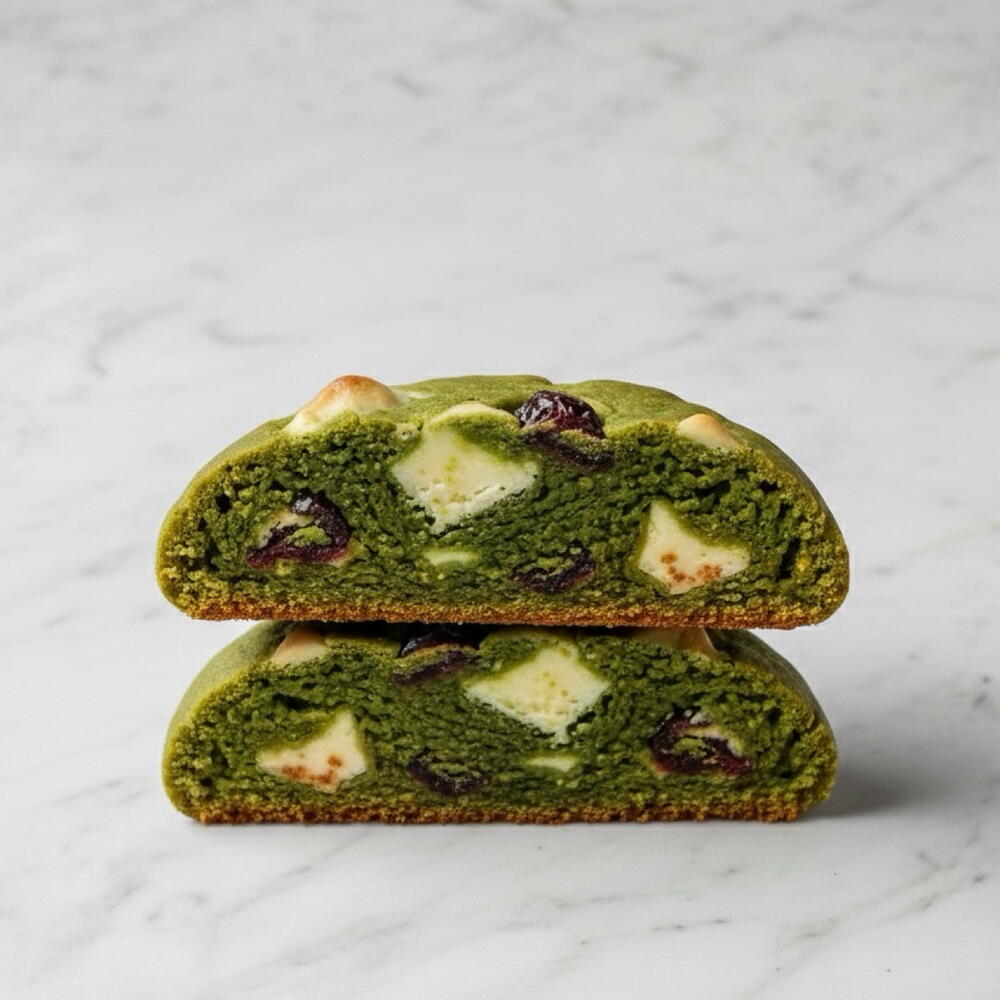 The cookies contain premium matcha powder, dried barberries, and white chocolate chips, in addition to standard cookie ingredients flour, butter, sugar, eggs, and leavening agents.