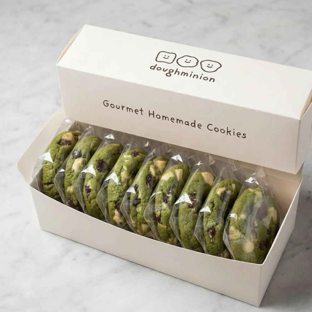 A total of 9 cookies Elevate your snack time with our exquisite box of nine cookies, a harmonious blend of earthy matcha, tangy barberries, and sweet white chocolate chips.