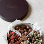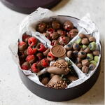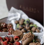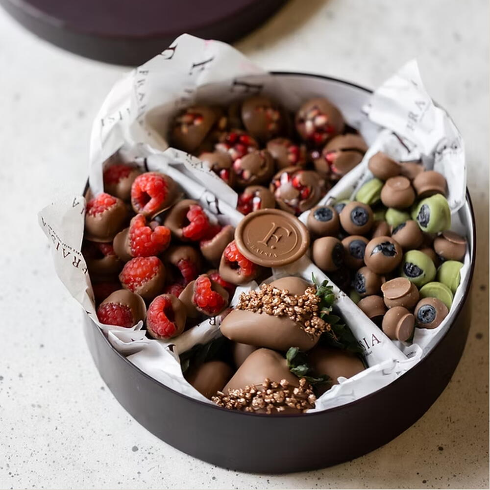 Indulge in the decadent pleasure of Fraisias Berry Dream, a box brimming with an assortment of chocolate-covered berries: raspberry, strawberry, blueberry, and pomegranate. Each berry is expertly dipped in rich, velvety chocolate, creating a harmonious blend of fruity tang and cocoa richness, designed to tantalize your taste buds and satisfy your cravings.