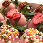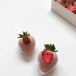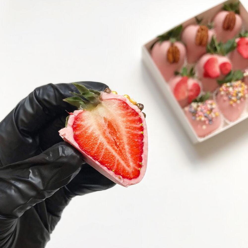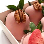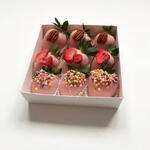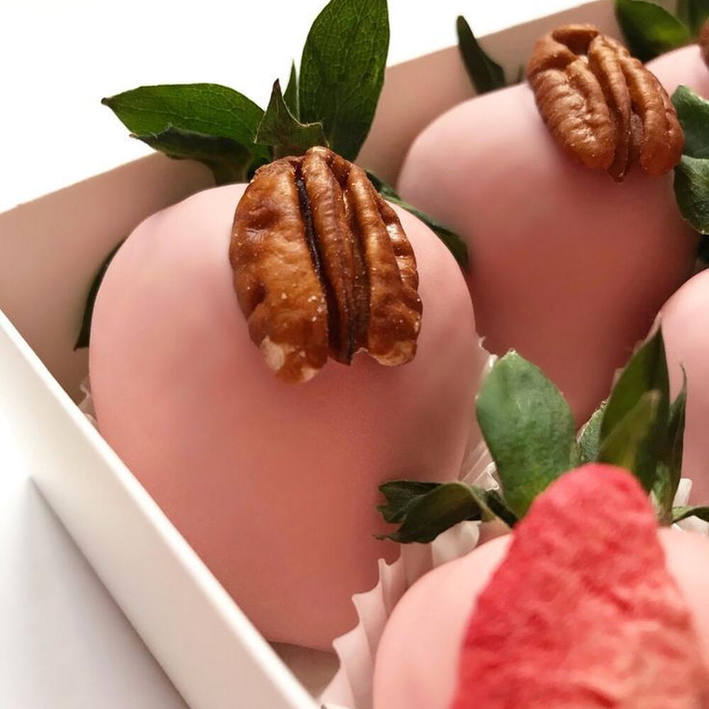 Box Includes: Fresh whole strawberries 250 gr Pink chocolate coating Colorful sugar sprinkles Freeze-dried strawberry slices Pecan halves Decorative paper cups Gift box packaging