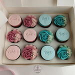 A box of 12 regular cupcakes with butter cream frosting, sprinkles and fondant design on top with customised filling inside blue or pink.