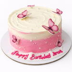 A dreamy butterfly-themed cake crafted with soft, fluffy vanilla sponge layers filled with strawberry buttercream and finished in smooth, velvety vanilla buttercream frosting. Adorned with delicate edible butterflies, gentle pastel tones, and elegant detailing, this cake captures a sense of beauty and grace—perfect for birthdays, celebrations, or any moment that calls for a touch of charm and whimsy.
