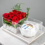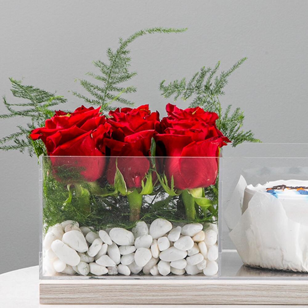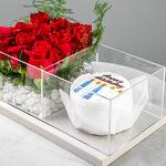Experience the exceptional with our customizable Bento Cake with Red Rose Combo. This exquisite cake is skillfully arranged in a chic Blooms acrylic Tray, adding an extra layer of elegance to your celebration. What makes it truly unique is the personalizable writing on the cake, which allows you to convey your heartfelt messages or wish someone special in the most delicious way. A perfect blend of beauty, taste, and personal touch, this Bento Cake is not just a dessert, its a memorable experience.