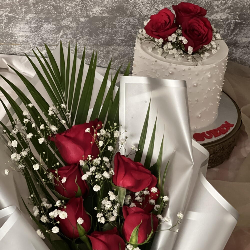 It's a moist & fluffy Choclate cake. It's filled with Choclate ganashe & Carramalised nuts for crunchiness. It's decorated with sugar springles & red roses to make special beauty. 6redrose bouquet also available as a combo with cake. To gift for someone special❣️