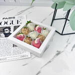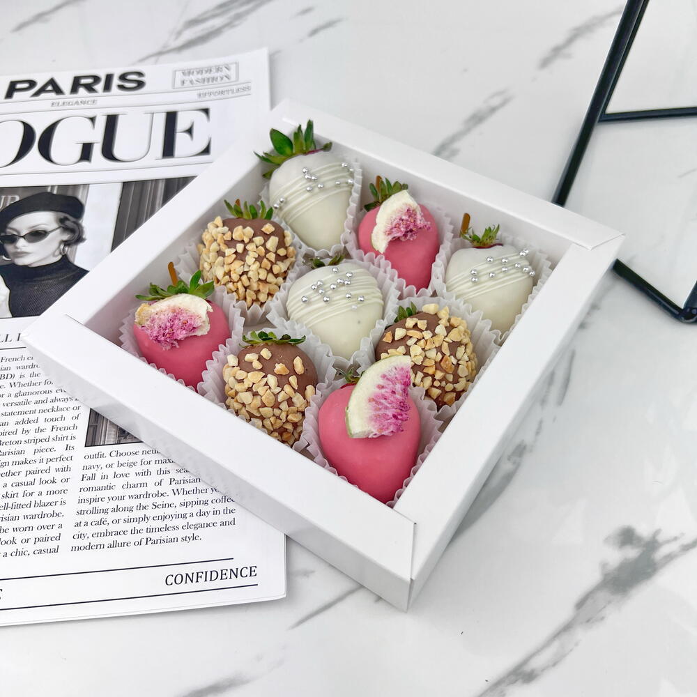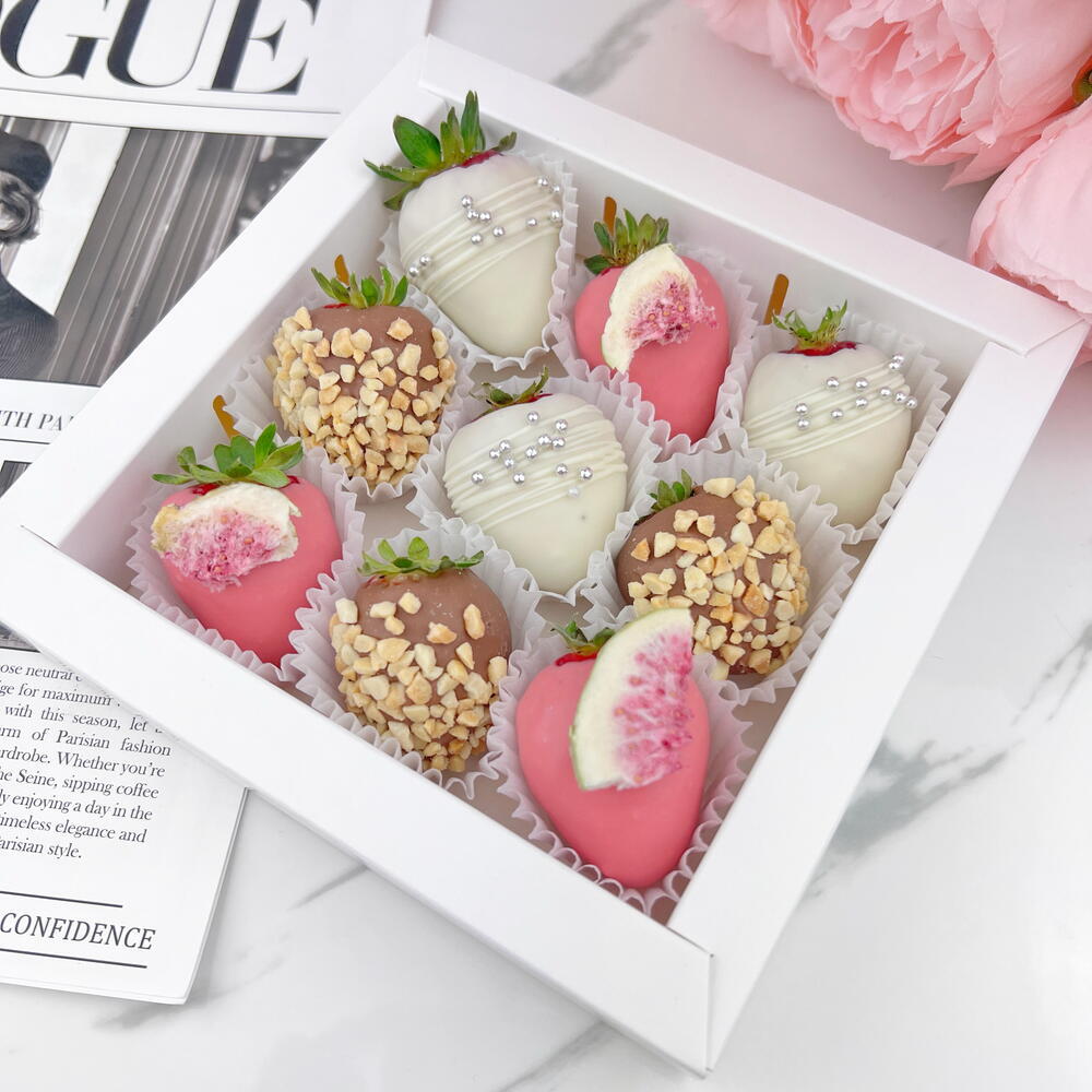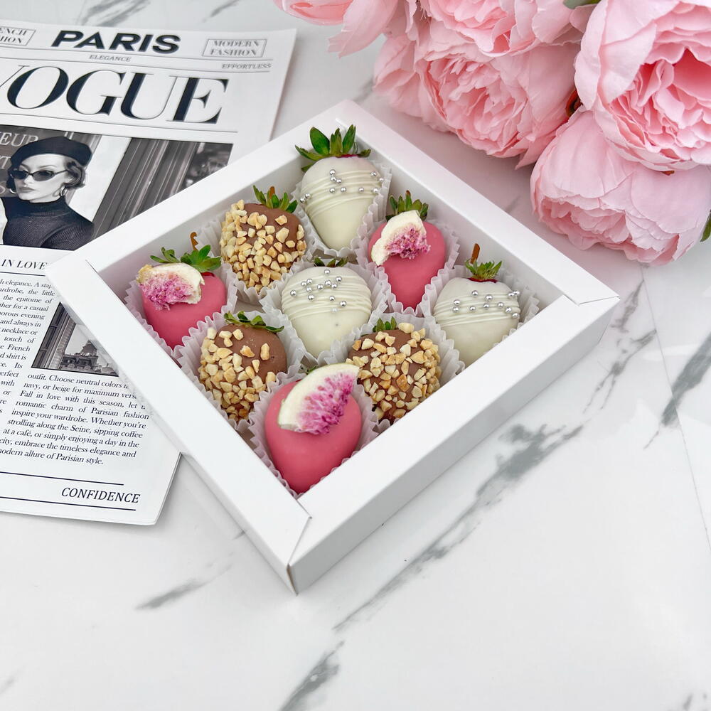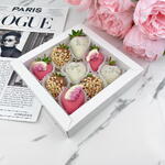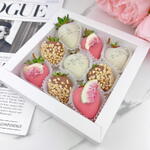 An exquisite selection of aromatic strawberries in milk, pink, and white chocolate with peanuts and figs, creating a true atmosphere of love and celebration! Ingredients: 9 chocolate-covered strawberries. Types of chocolate used: Callebaut (Belgium) pink, white, and milk chocolate. (sugar, cocoa butter (27.4%), whole milk powder, emulsifier: soy lecithin, natural vanilla flavoring);