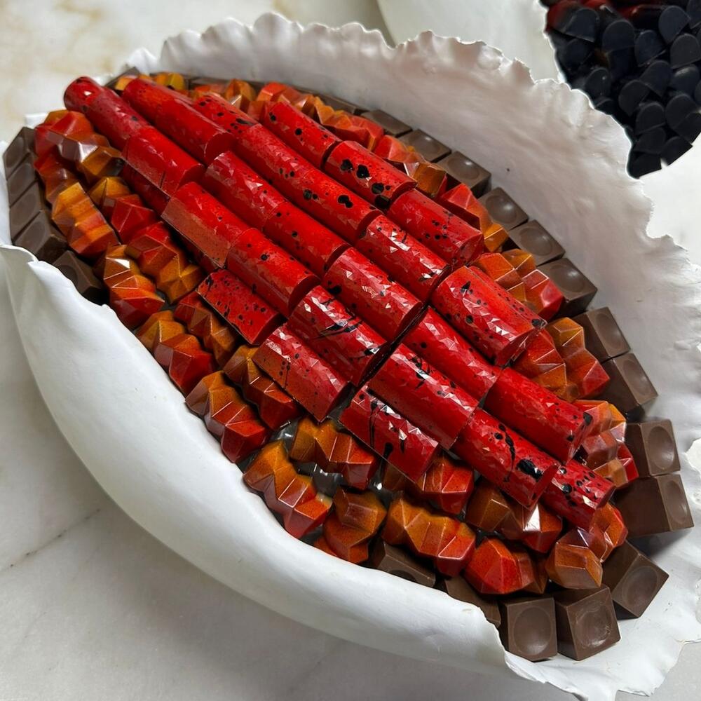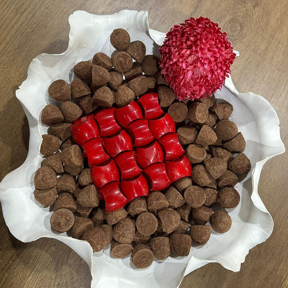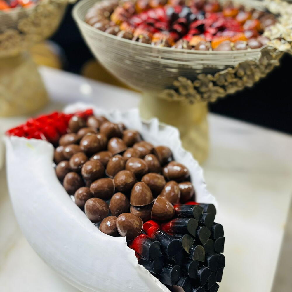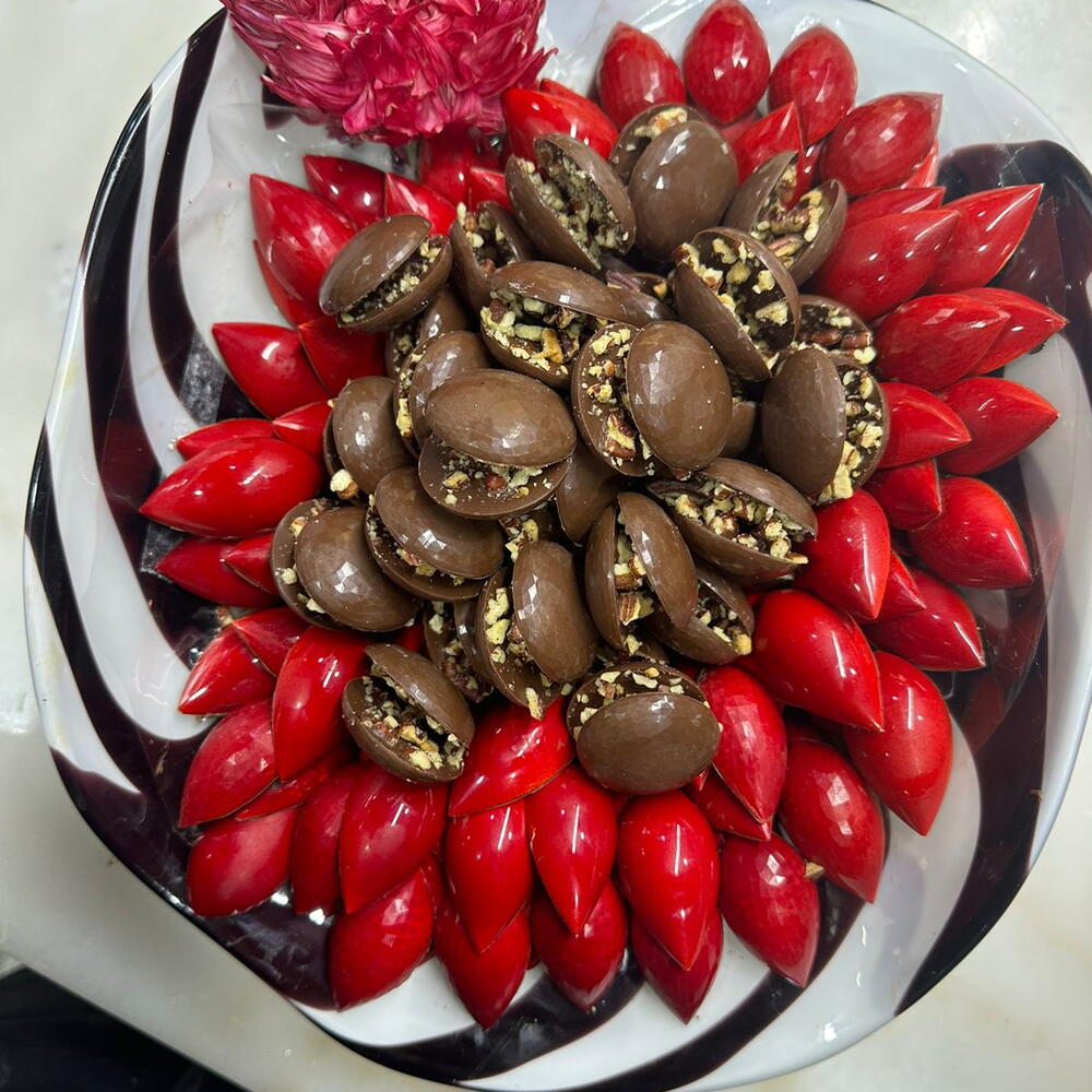 -Premium Milk Chocolate -Flavors: Pistaccio crunchy/ Ganache Pecan red fruit/ Hazelnut/ Lemon/ Caramel/ Ganache chocolate -Colored cocoa butter