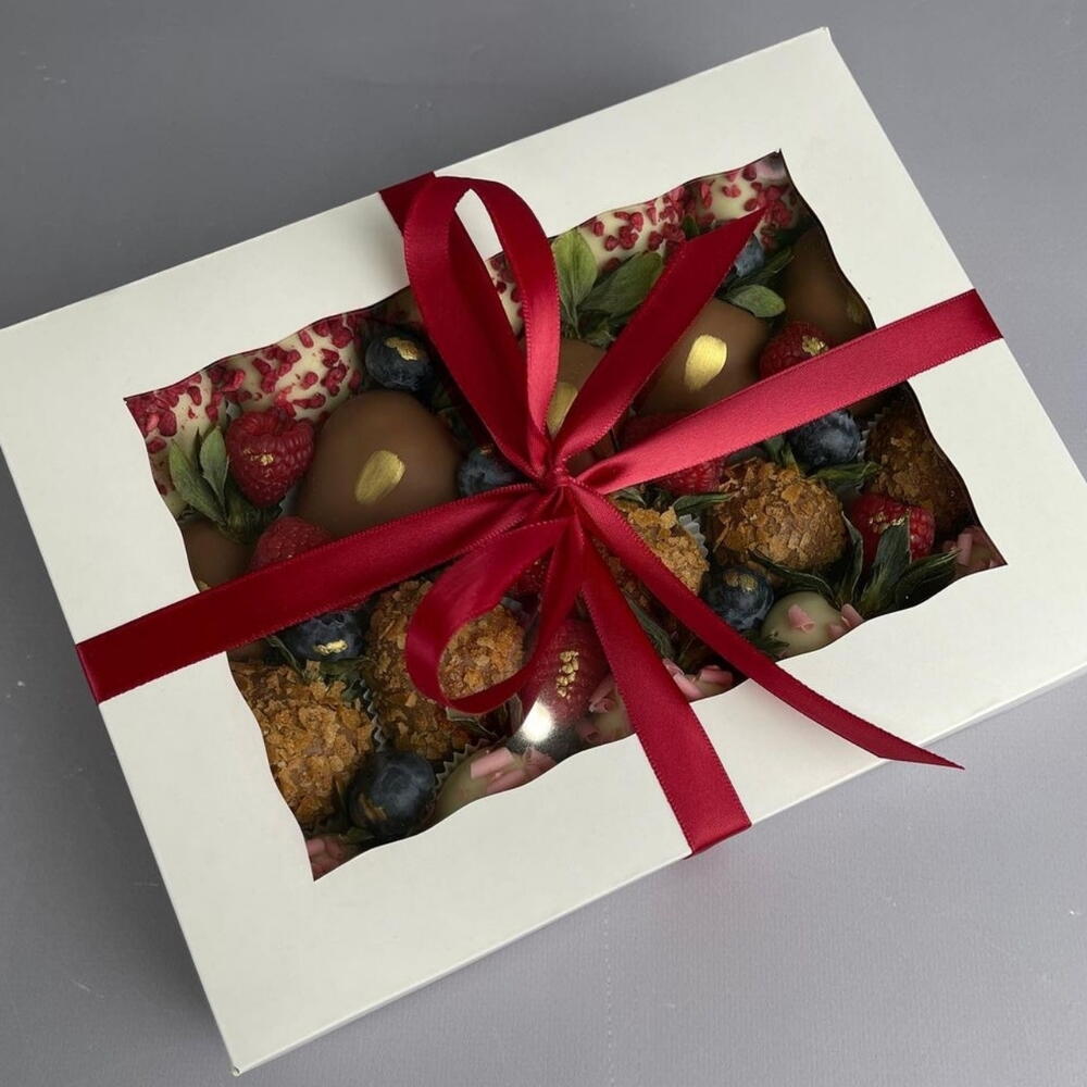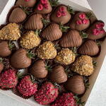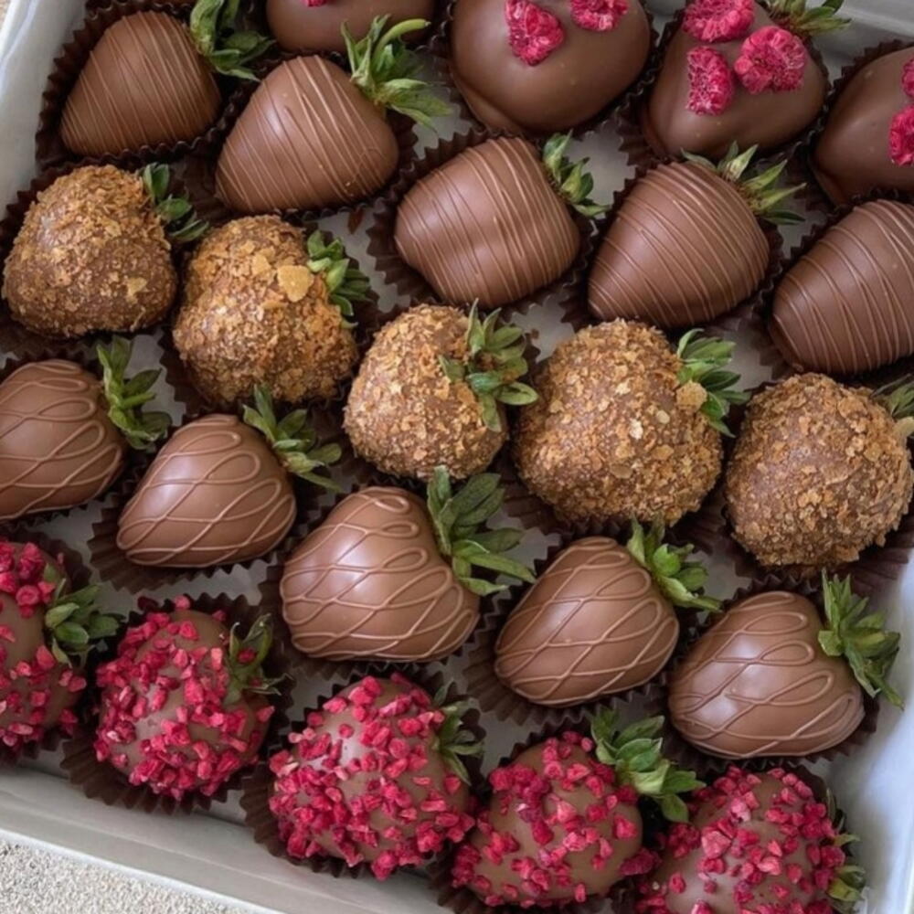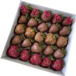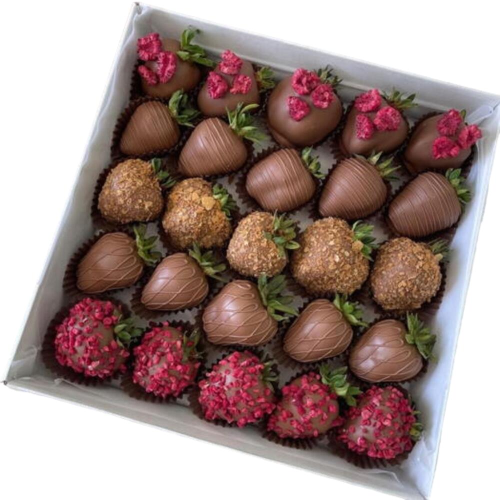 An exquisite assortment of chocolate-covered strawberries, crafted for true dessert lovers. This elegant gift box features fresh strawberries dipped in smooth milk chocolate and finished with a variety of gourmet toppings, including crunchy nut coating and vibrant freeze-dried raspberry pieces. Each strawberry is carefully handmade and beautifully arranged to create a rich mix of textures and flavors — creamy, crunchy, and fruity in every bite. Perfect for birthdays, anniversaries, romantic surprises, corporate gifts, or special celebrations. Box Includes: • Milk chocolate-covered strawberries • Strawberries with crunchy nut coating • Strawberries topped with freeze-dried raspberry pieces • Decorative chocolate drizzle • Premium gift box Ingredients: Fresh strawberries, milk chocolate (cocoa mass, cocoa butter, sugar, milk powder, emulsifier: soy lecithin, natural vanilla flavor), nut coating (crushed nuts, sugar), freeze-dried raspberries. Allergen Information: Contains milk, soy, and nuts. May contain traces of peanuts and other nuts. Storage Shelf Life: Keep refrigerated at +2°C to +6°C. Best consumed within 24 hours of delivery for optimal freshness.